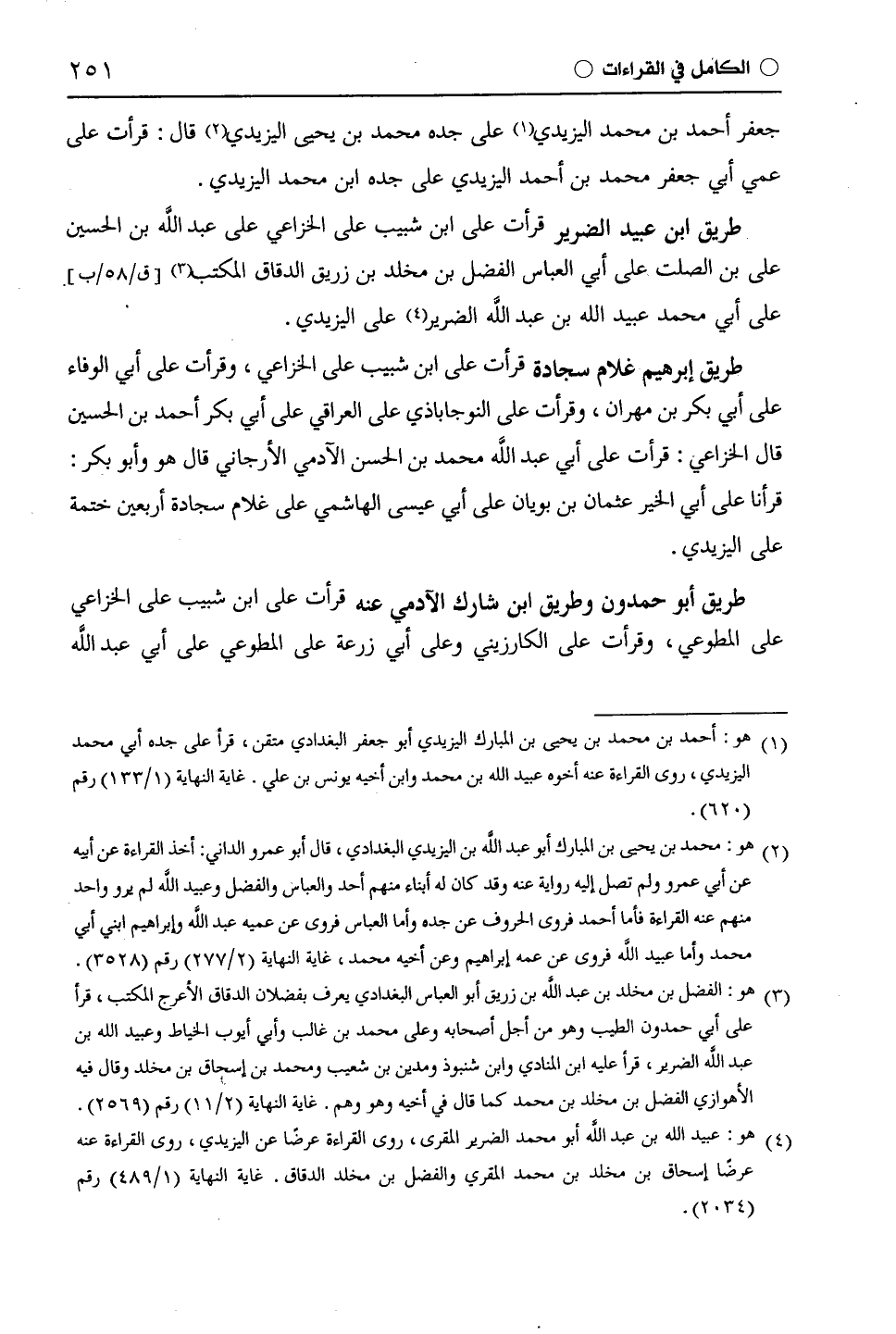 جعفر أحمد بن محمد الْيَزِيدِيّ على جده محمد بن يحيى الْيَزِيدِيّ قال: قرأت على عمي أبي جعفر محمد بن أحمد الْيَزِيدِيّ على جده ابن محمد الْيَزِيدِيّ.