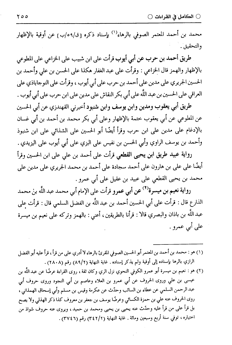 رواية نعيم بن ميسرة عن أَبِي عَمْرٍو قرأت على الإمام أبي محمد عبد اللَّه بن محمد الذارع قال: قرأت على أبي الحسين أحمد بن عبد اللَّه بن الفضل السُّلَمِيّ قال: قرأت على عبد اللَّه بن باذان والبصري قالا: قرأنا بالطريقين، أعني: بالهمز وتركه على نعيم بن ميسرة على أَبِي عَمْرٍو.