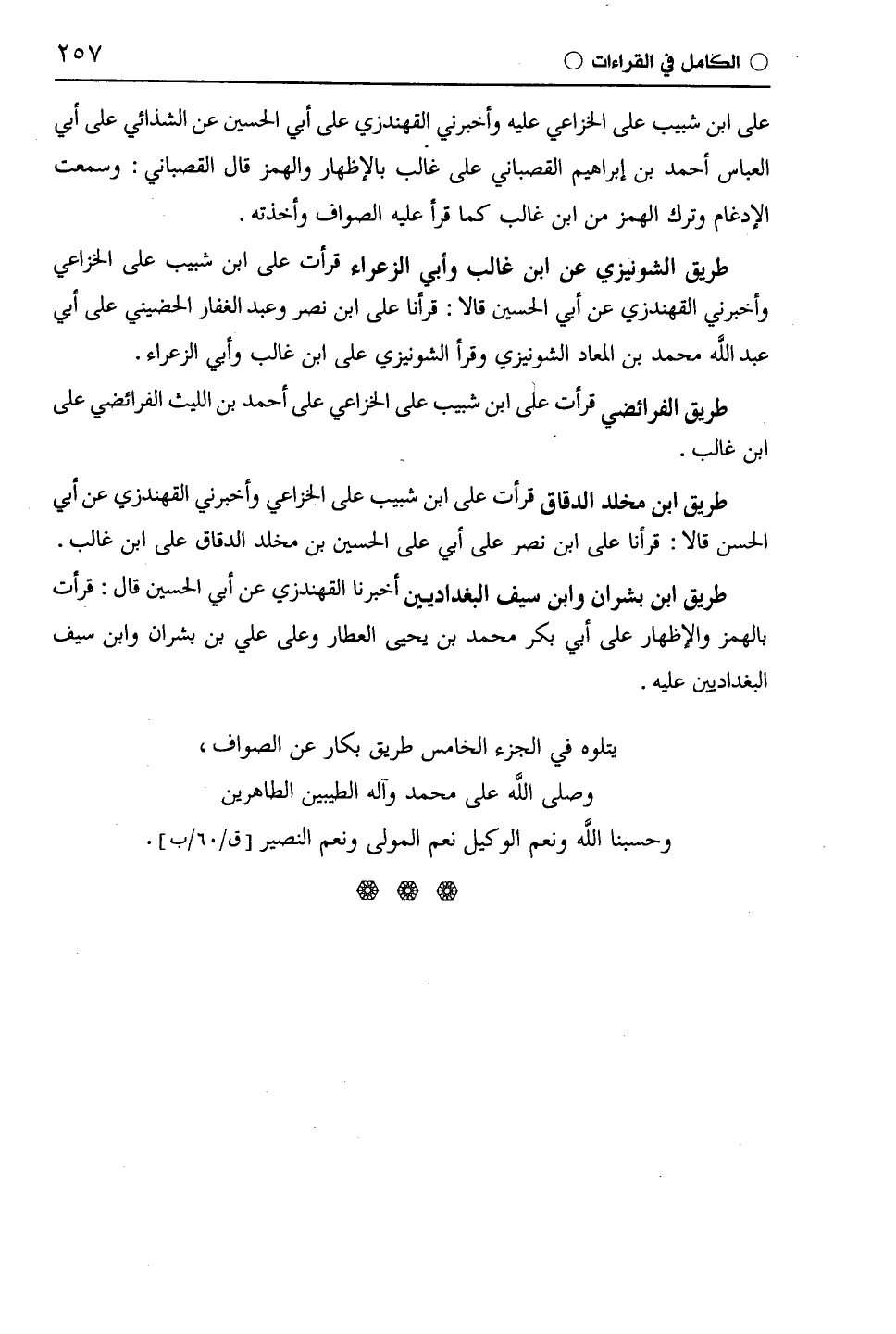 على ابْن شَبِيبٍ على الْخُزَاعِيّ عليه وأخبرني الْقُهُنْدَزِيّ على أبي الحسين عن الشَّذَائِيّ على أبي العباس أحمد بن إبراهيم القصباني على غالب بالإظهار والهمز قال القصباني: وسمعت الإدغام وترك الهمز من ابن غالب كما قرأ عليه الصواف وأخذته.