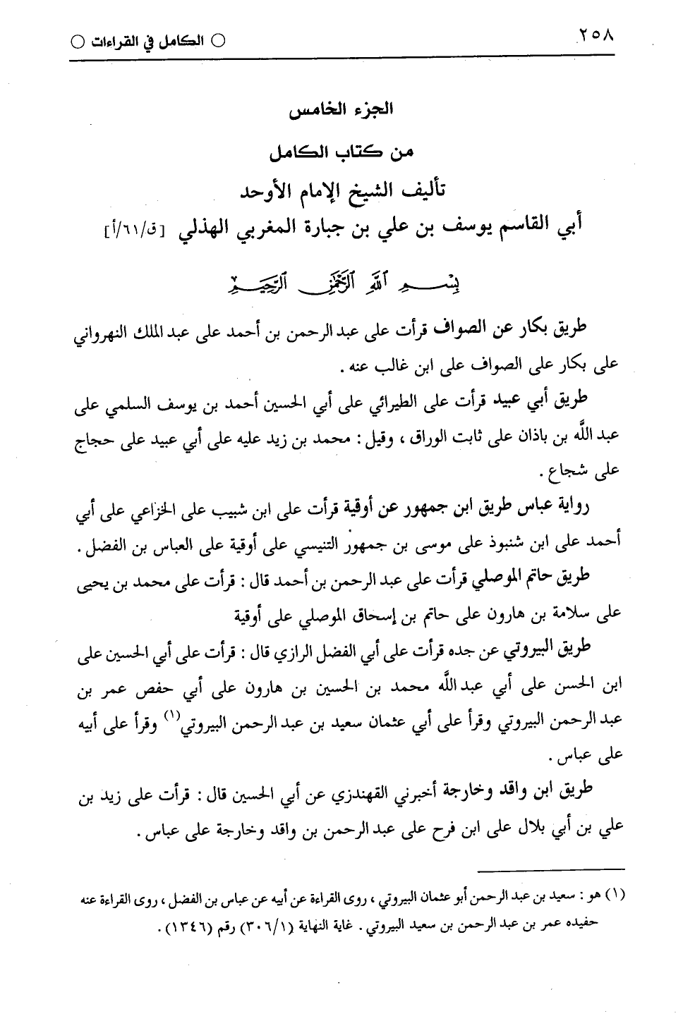 طريق البيروتي عن جده قرأت على أبي الفضل الرَّازِيّ قال: قرأت على أبي الحسين على ابن الحسن على أبي عبد اللَّه محمد بن الحسين بن هارون على أبي حفص عمر بن عبد الرحمن البيروتي وقرأ على أبي عثمان سعيد بن عبد الرحمن البيروتي وقرأ على أبيه على عباس.
