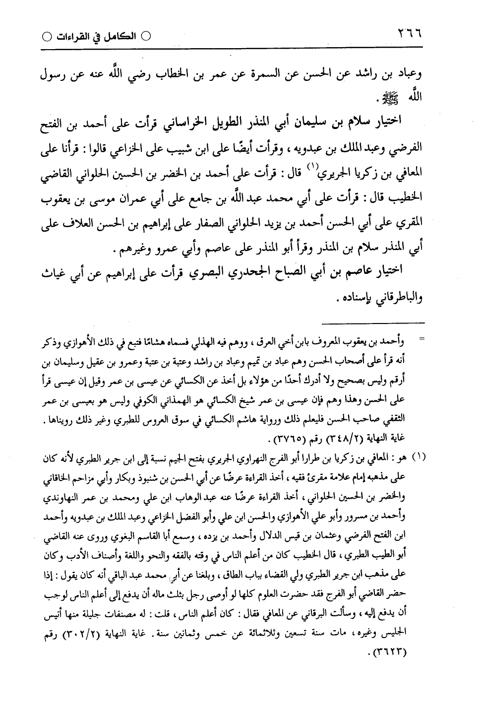 اختيار سلام بن سليمان أبي المنذر الطويل الخراساني قرأت على أحمد بن الفتح الفرضي وعبد الملك بن عبدويه، وقرأت أيضًا على ابْن شَبِيبٍ على الْخُزَاعِيّ قالوا: قرأنا على المعافي بن زكريا الجريري قال: قرأت على أحمد بن الخضر بن الحسين الحلواني القاضي الخطيب قال: قرأت على أبي محمد عبد اللَّه بن جامع على أبي عمران موسى بن يعقوب المقري على أبي الحسن أحمد بن يزيد الحلواني الصفار على إبراهيم بن الحسن العلاف على أبي المنذر سلام بن المنذر وقرأ أبو المنذر على عَاصِم وأَبِي عَمْرٍو وغيرهم.