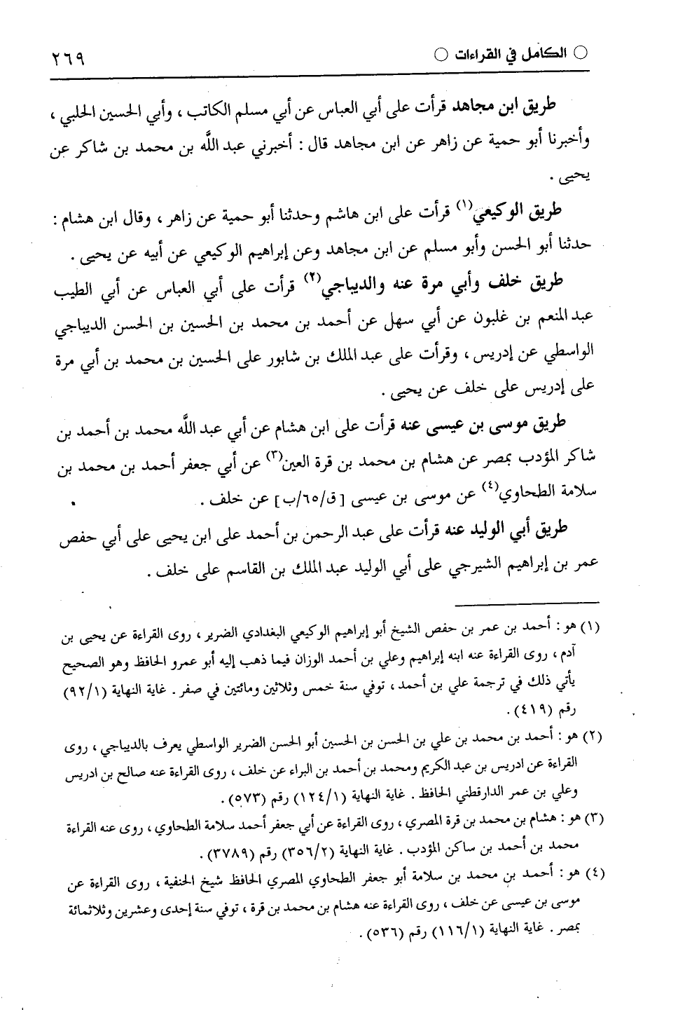 طريق الوكيعي قرأت على ابن هاشم وحدثنا أبو حمية عن زاهر، وقال ابن هشام: حدثنا أبو الحسن وأبو مسلم عن ابن مجاهد وعن إبراهيم الوكيعي عن أبيه عن يحيى.