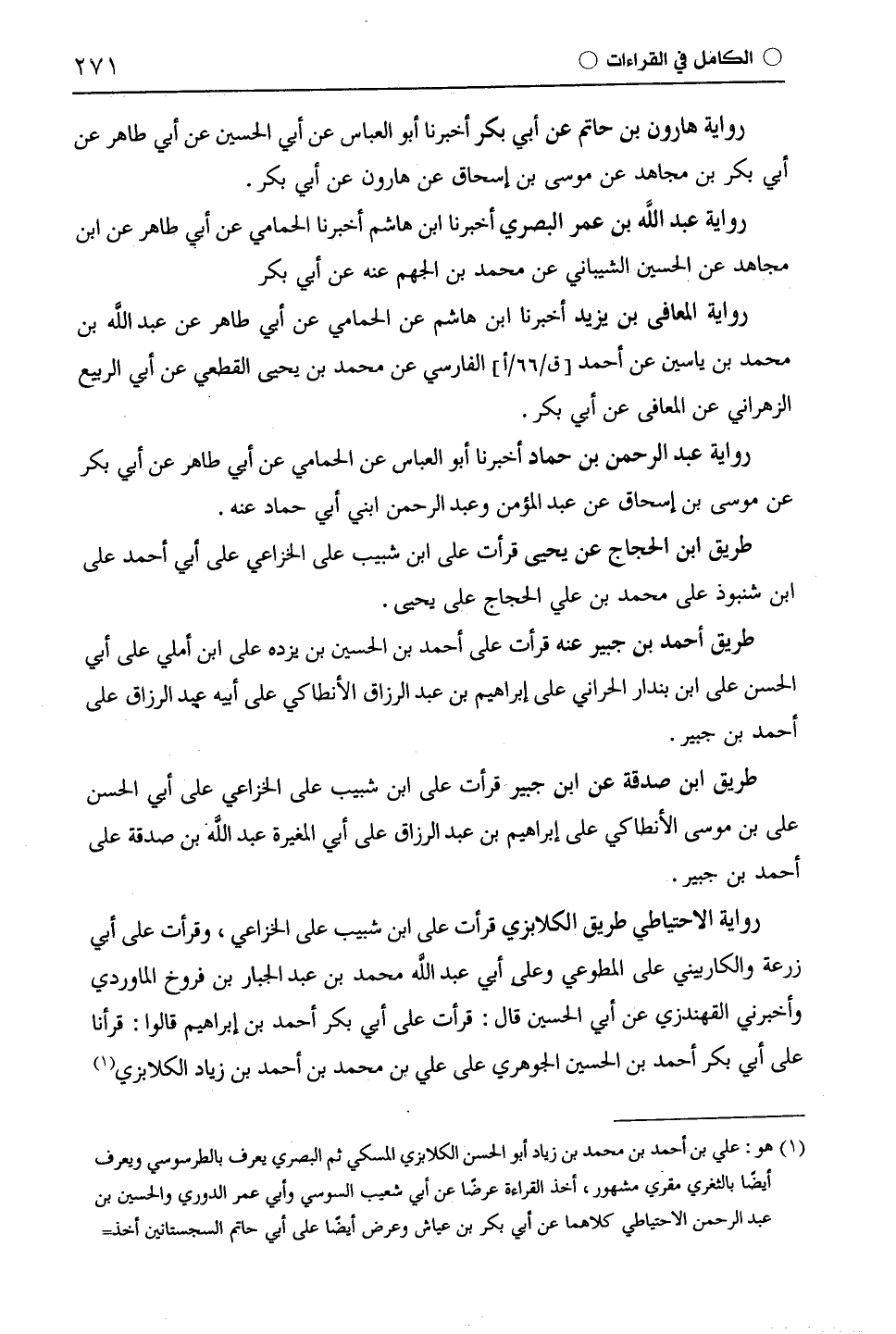 رواية عبد اللَّه بن عمر البصري أخبرنا ابن هاشم أخبرنا الْحَمَّامِيّ عن أبي طاهر عن ابن مجاهد عن الحسين الشيباني عن محمد بن الجهم عنه عن أبي بكر رواية المعافى بن يزيد أخبرنا ابن هاشم عن الْحَمَّامِيّ عن أبي طاهر عن عبد اللَّه بن محمد بن ياسين عن أحمد الفارسي عن محمد بن يحيى القطعي عن أبي الربيع الزهراني عن المعافى عن أبي بكر.