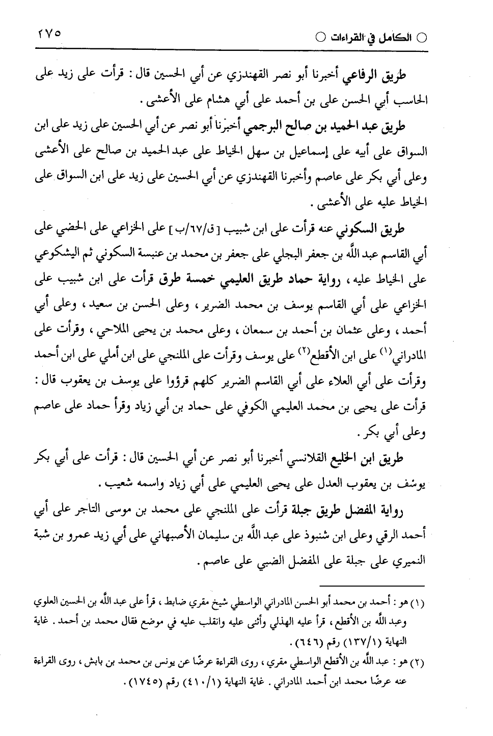 طريق الرفاعي أخبرنا أبو نصر الْقُهُنْدَزِيّ عن أبي الحسين قال: قرأت على زيد على الحاسب أبي الحسن على بن أحمد على أبي هشام على الأعشى.