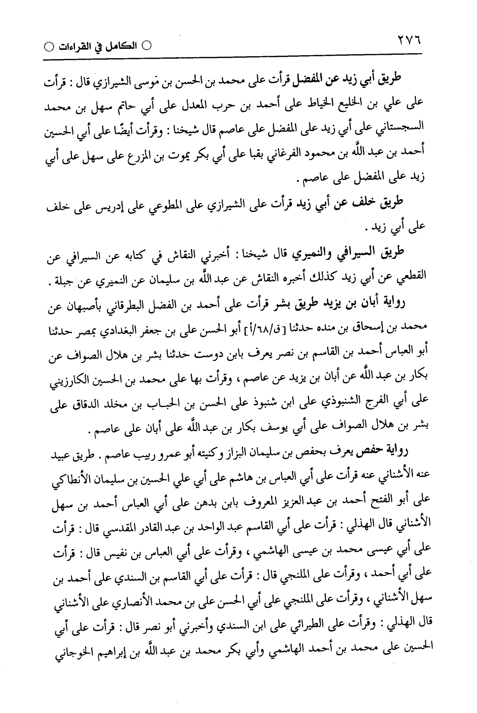 طريق أبي زيد عن المفضل قرأت على محمد بن الحسن بن موسى الشيرازي قال: قرأت على علي بن الخليع الخياط على أحمد بن حرب المعدل على أبي حاتم سهل بن محمد السجستاني على أبي زيد على المفضل على عَاصِم قال شيخنا: وقرأت أيضًا على أبي الحسين أحمد بن عبد اللَّه بن محمود الفرغاني بقبا على أبي بكر يموت بن المزرع على سهل على أبي زيد على المفضل على عَاصِم.