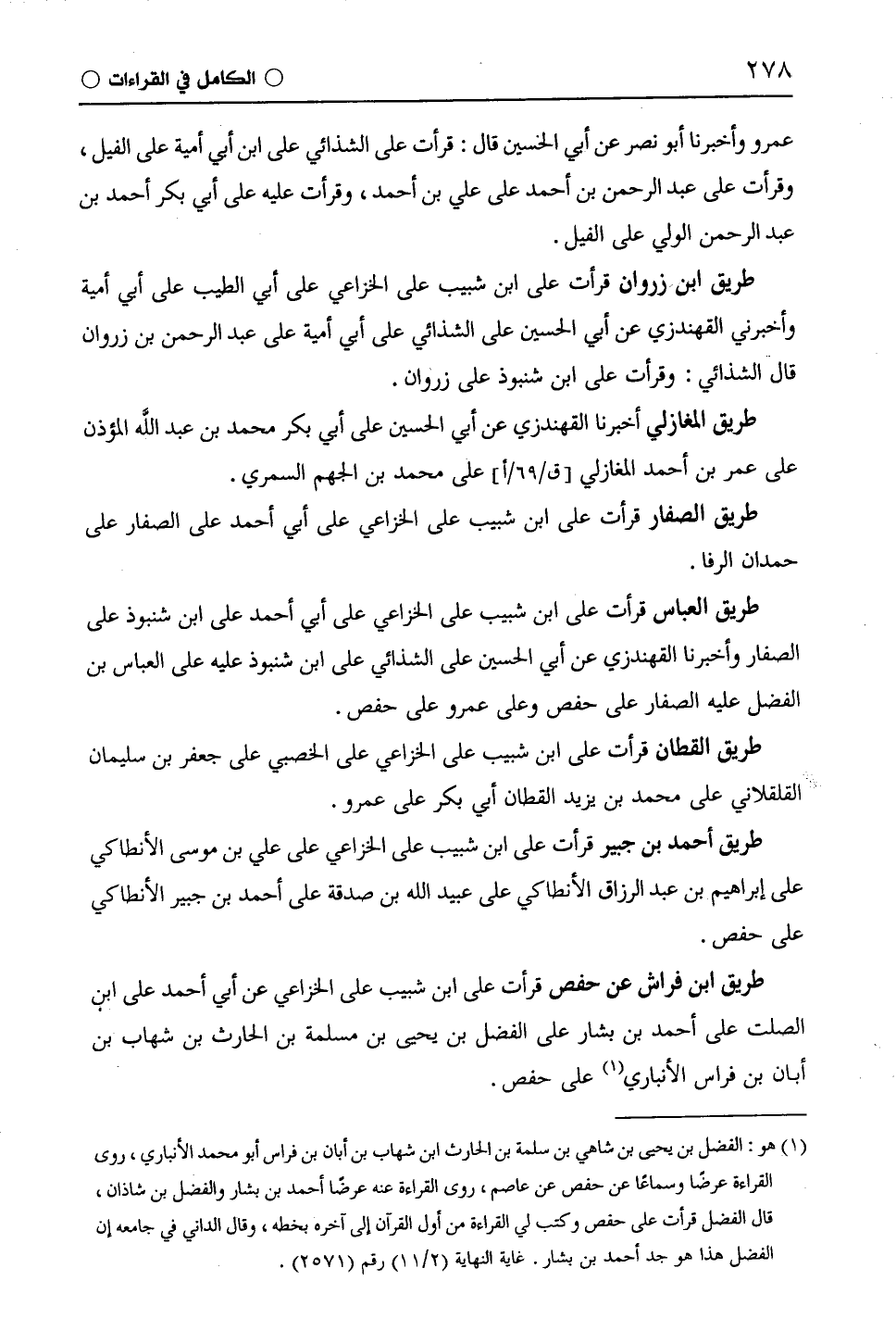 طريق ابن فراش عن حفص قرأت على ابْن شَبِيبٍ على الْخُزَاعِيّ عن أبي أحمد على ابن الصلت على أحمد بن بشار على الفضل بن يحيى بن مسلمة بن الحارث بن شهاب بن أبان بن فراس الأنباري على حفص.