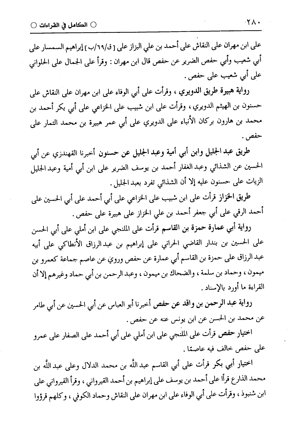 اختيار أبي بكر قرأت على أبي القاسم عبد اللَّه بن محمد الدلال وعلى عبد اللَّه بن محمد الذارع قرأا على أحمد بن يوسف على إبراهيم بن أحمد القيرواني، وقرأ القيرواني على ابْن شَنَبُوذَ، وقرأت على أبي الوفاء على ابن مهران على النَّقَّاش وحماد الكوفي، وكلهم قرؤوا