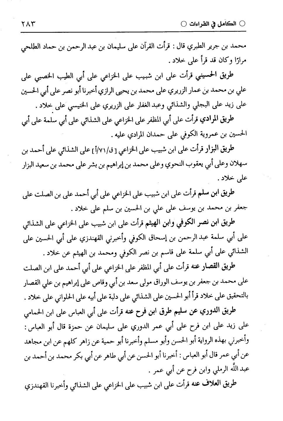 طريق ابن نصر الكوفي وابن الهيثم قرأت على ابْن شَبِيبٍ على الْخُزَاعِيّ على الشَّذَائِيّ على أبي سلمة عبد الرحمن بن إسحاق الكوفي وأخبرني الْقُهُنْدَزِيّ على أبي الحسين على الشَّذَائِيّ على أبي سلمة على قاسم بن نصر الكوفي ومحمد بن الهيثم عن خلاد.