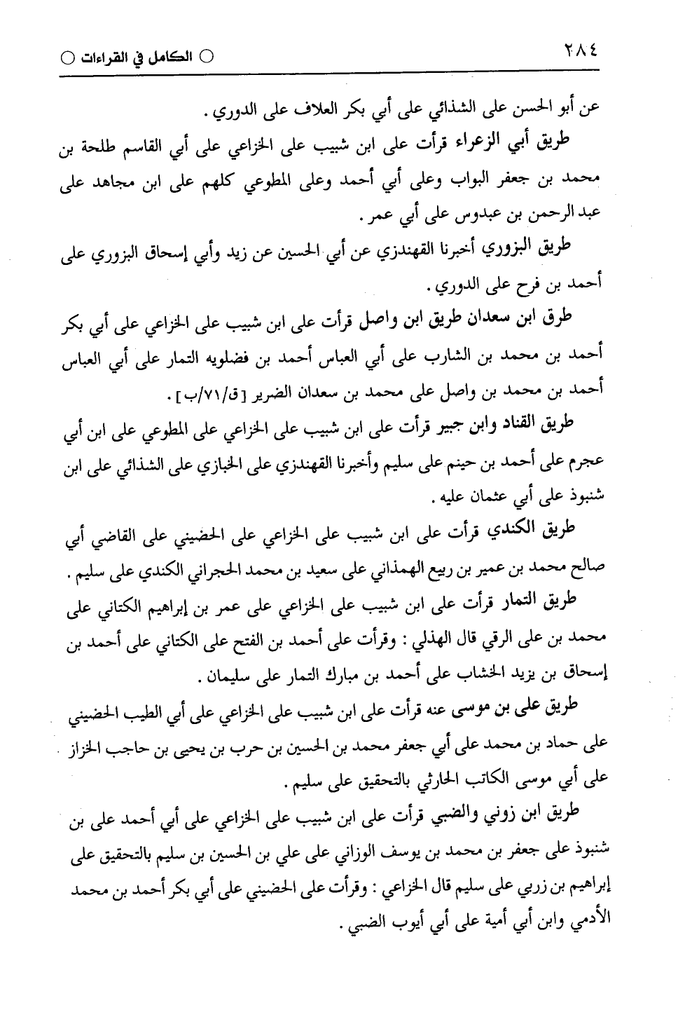 طريق أبي الزعراء قرأت على ابْن شَبِيبٍ على الْخُزَاعِيّ على أبي القاسم طَلْحَة بن محمد بن جعفر البواب وعلى أبي أحمد وعلى الْمُطَّوِّعِيّ كلهم على ابن مجاهد على عبد الرحمن بن عبدوس على أبي عمر.