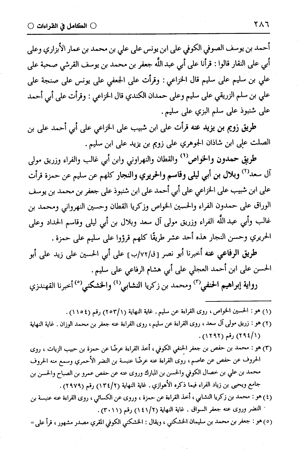 أحمد بن يوسف الصوفي الكوفي على ابن يونس على علي بن محمد بن عمار الأبزاري وعلى أبي على النقار قالوا: قرأنا على أبي عبد اللَّه جعفر بن محمد بن يوسف القرشي صحبة على علي بن سليم على سليم قال الْخُزَاعِيّ: وقرأت على الجعفي على يونس على صنجة على علي بن سلم الزريقي على سليم وعلى حمدان الكندي قال الْخُزَاعِيّ: وقرأت على أبي أحمد على شنبوذ على سلم البزي على سليم.