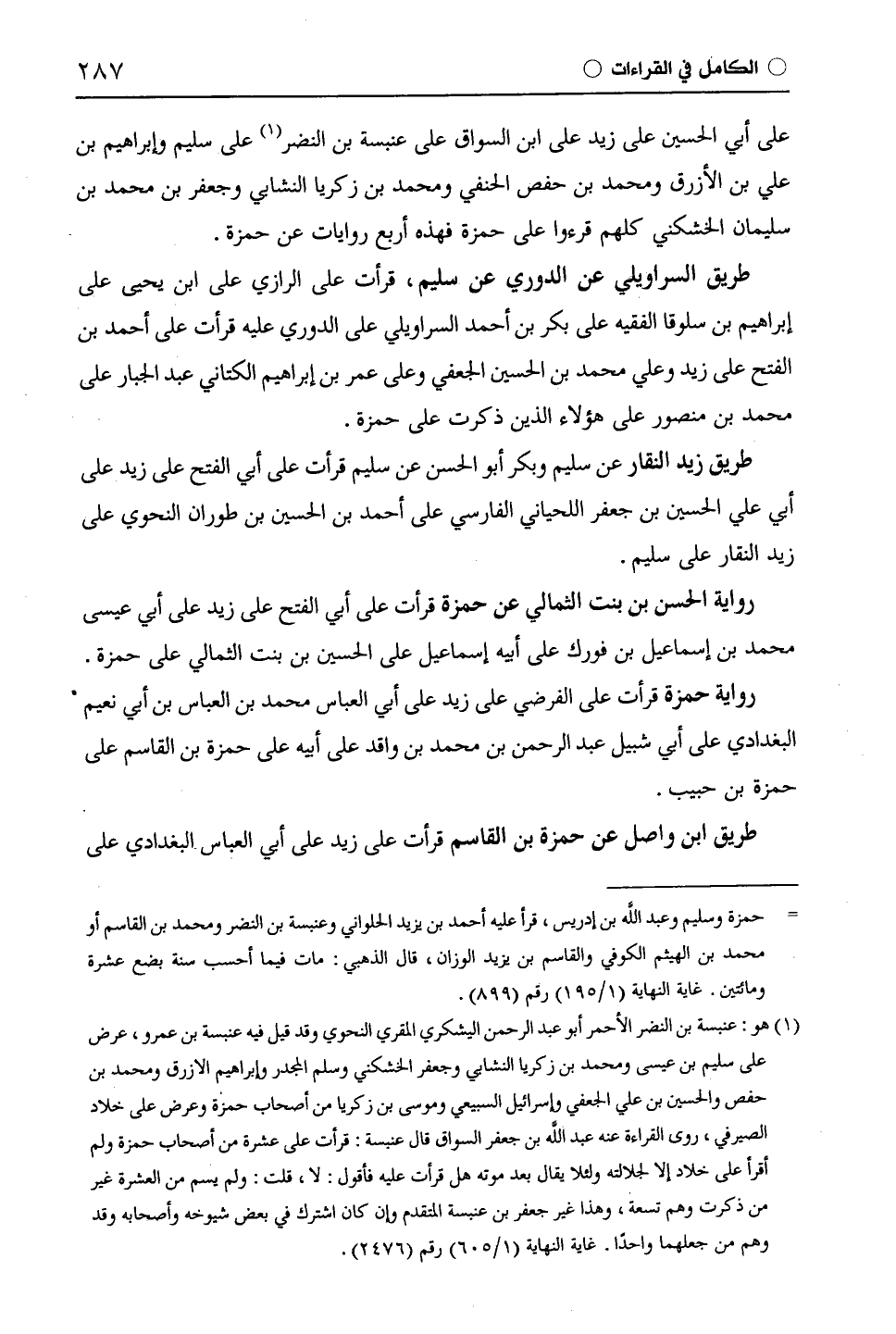 على أبي الحسين على زيد على ابن السواق على عنبسة بن النضر على سليم وإبراهيم بن علي بن الأزرق ومحمد بن حفص الحنفي ومحمد بن زكريا النشابي وجعفر بن محمد بن سليمان الخشكني كلهم قرءوا على حَمْزَة فهذه أربع روايات عن حَمْزَة.