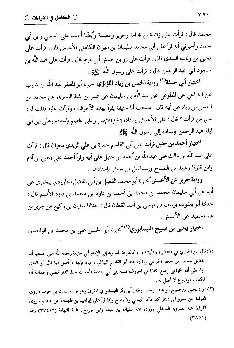 محمد قال: قرأت على زائدة بن قدامة وجرير وعصمة وأيضا أحمد على الْعَبْسِيّ وابن أبي حماد وأخبرني أنه قرأ على أبي محمد سليمان بن مهران الكاهلي الْأَعْمَش قال: قرأت على يحيى بن وثاب السدي قال: قرأت على زر بن حبيش أبي مريم قال: قرأت على عبد اللَّه بن مسعود أبي عبد الرحمن قال: قرأت على رسول اللَّه - صلى الله عليه وسلم -.