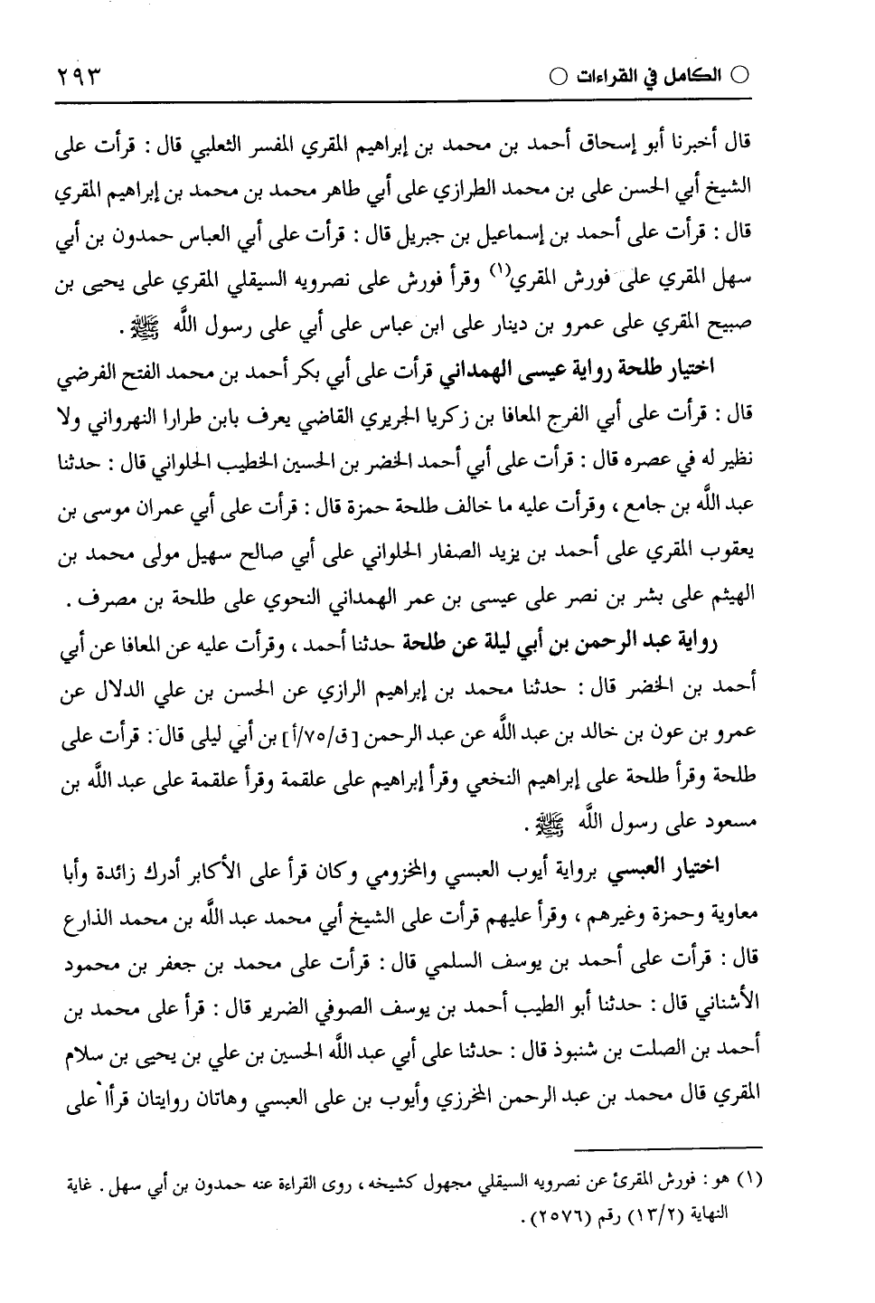 اختيار طَلْحَة رواية عيسى الهمداني قرأت على أبي بكر أحمد بن محمد الفتح الفرضي قال: قرأت على أبي الفرج المعافا بن زكريا الجريري القاضي يعرف بابن طرارا النهرواني ولا نظير له في عصره قال: قرأت على أبي أحمد الخضر بن الحسين الخطيب الحلواني قال: حدثنا عبد اللَّه بن جامع، وقرأت عليه ما خالف طَلْحَة حَمْزَة قال: قرأت على أبي عمران موسى بن يَعْقُوب المقري على أحمد بن يزيد الصفار الحلواني على أبي صالح سهيل مولى محمد بن الهيثم على بشر بن نصر على عيسى بن عمر الهمداني النحوي على طَلْحَة بن مصرف.