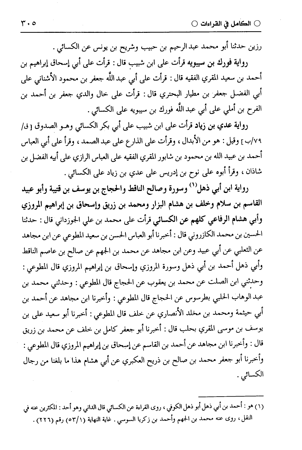 رواية ابن أبي ذهل وسورة وصالح الناقط والْحَجَّاج بن يوسف بن قُتَيْبَة وأبو عبيد القاسم بن سلام وخلف بن هشام البزار ومحمد بن زريق وإسحاق بن إبراهيم المروزي وأبي هشام الرفاعي كلهم عن الكسائي قرأت على محمد بن علي الجوزداني قال: حدثنا الحسين بن محمد الكازروني قال: أخبرنا أبو العباس الحسن بن سعيد الْمُطَّوِّعِيّ عن ابن مجاهد عن الثعلبي عن أبي عبيد وعن ابن مجاهد عن محمد بن الجهم عن صالح بن عَاصِم الناقط وأبي ذهل أحمد بن أبي ذهل وسورة المروزي وإسحاق بن إبراهيم المروزي قال الْمُطَّوِّعِيّ: وحدثني ابْن الصَّلْتِ عن محمد بن يَعْقُوب عن الْحَجَّاج قال الْمُطَّوِّعِيّ: وحدثني محمد بن عبد الوهاب الحلبي بطرسوس عن الْحَجَّاج قال الْمُطَّوِّعِيّ: وأخبرنا ابن مجاهد عن أحمد بن أبي حيثمة ومحمد بْن مُخَلَّدٍ الأنصاري عن خلف قال الْمُطَّوِّعِيّ: أخبرنا أبو سعيد على بن يوسف بن موسى المقري بحلب قال: أخبرنا أبو جعفر كامل بن خلف عن محمد بن زريق قال: وأخبرنا ابن مجاهد عن أحمد بن القاسم عن إسحاق بن إبراهيم المروزي قال الْمُطَّوِّعِيّ: وأخبرنا أبو جعفر محمد بن صالح بن ذريح العكبري عن أبي هشام هذا ما بلغنا من رجال الكسائي.