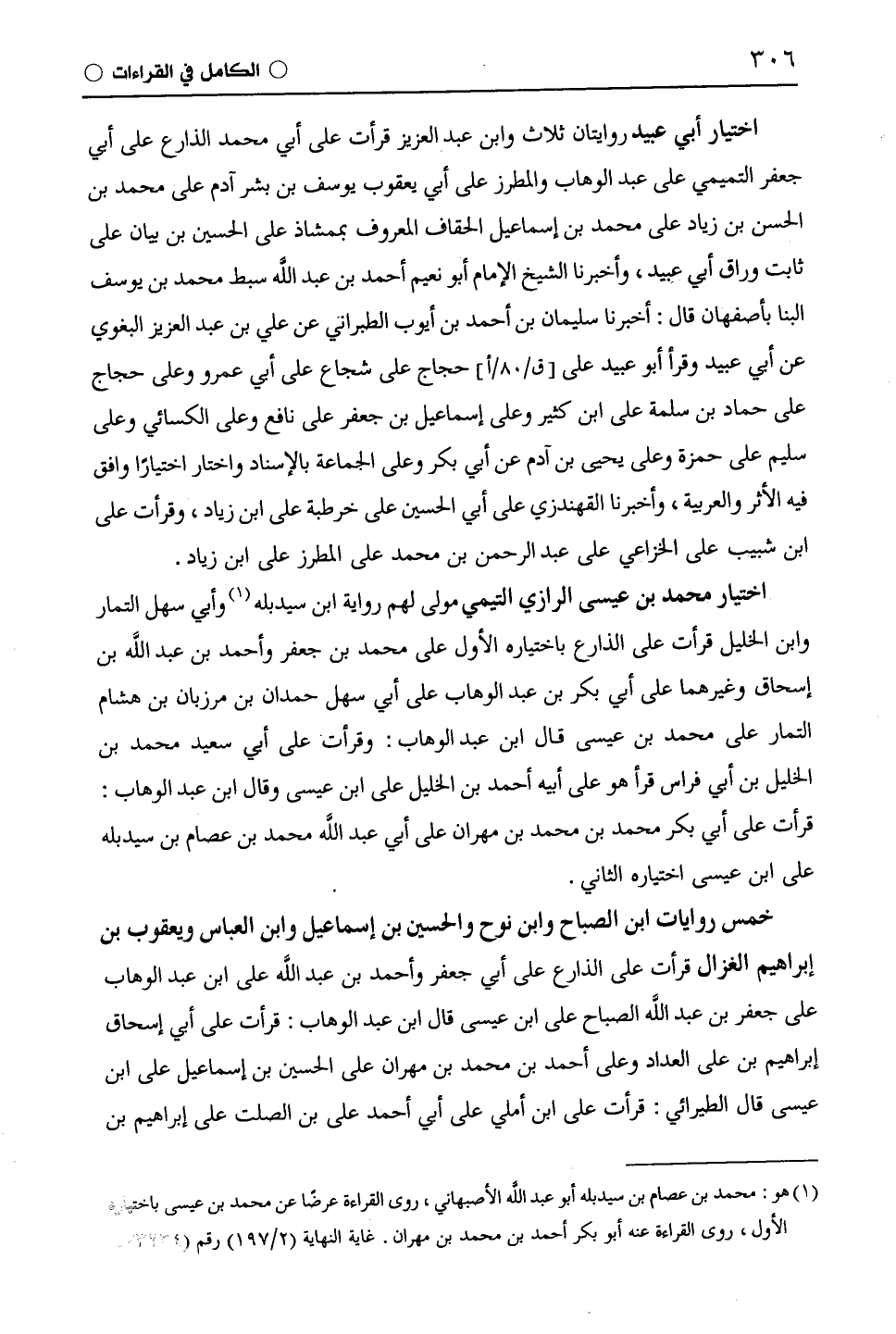 خمس روايات ابْن الصَّبَّاحِ وابن نوح والحسين بن إسماعيل وابن العباس ويَعْقُوب بن إبراهيم الغزال قرأت على الذارع على أبي جعفر وأحمد بن عبد اللَّه على ابن عبد الوهاب على جعفر بن عبد اللَّه الصباح على ابن عيسى قال ابن عبد الوهاب: قرأت على أبي إسحاق إبراهيم بن على العداد وعلى أحمد بن محمد بن مهران على الحسين بن إسماعيل على ابن عيسى قال الطَّيْرَائِيِّ: قرأت على ابن أملي على أبي أحمد على بْن الصَّلْتِ على إبراهيم بن