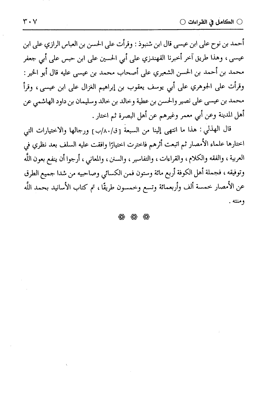 قال الْهُذَلِيّ: هذا ما انتهى إلينا من السبعة ورجالها والاختيارات التي اختارها علماء الأمصار ثم اتبعت أثرهم فاخترت اختيارًا وافقت عليه السلف بعد نظري في العربية، والفقه والكلام، والقراءات، والتفاسير، والسنن، والمعاني، أرجوا أن ينفع بعون اللَّه وتوفيقه، فجملة أهل الكوفة أربع مائة وستون فمن الكسائي وصاحبيه من شدا جميع الطرق عن الأمصار خمسة ألف وأربعمائة وتسع وخمسون طريفًا، تم كتاب الأسانيد بحمد اللَّه ومِنَّتِهِ.