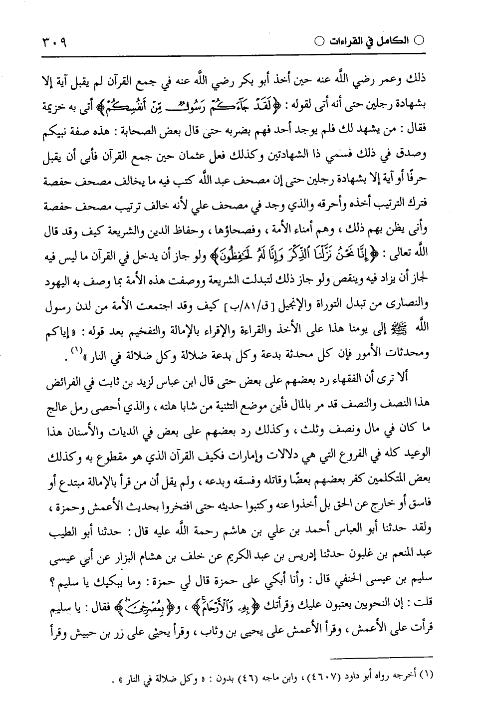 ألا ترى أن الفقهاء رد بعضهم على بعض حتى قال ابن عباس لزيد بن ثابت في الفرائض هذا النصف والنصف قد مر بالمال فأين موضع التثنية من شابا هلته، والذي أحصى رمل عالج ما كان في مال ونصف وثلث، وكذلك رد بعضهم على بعض في الديات والأسنان هذا الوعيد كله في الفروع التي هي دلالات وإمارات فكيف القرآن الذي هو مقطوع به وكذلك بعض المتكلمين كفر بعضهم بعضًا وقاتله وفسقه وبدعه، ولم يقل أن من قرأ بالإمالة مبتدع أو فاسق أو خارج عن الحق بل أخذوا عنه وكتبوا حديثه حتى افتخروا بحديا الْأَعْمَش وحَمْزَة، ولقد حدثنا أبو العباس أحمد بن علي بن هاشم رحمة اللَّه عليه قال: حدثنا أبو الطيب عبد المنعم بن غلبون حدثنا إدريس بن عبد الكريم عن خلف بن هشام البزار عن أبي عيسى سليم بن عيسى الحنفي قال: وأنا أبكي على حَمْزَة قال لي حَمْزَة: وما يبكيك يا سليم؟ قلت: إن النحويين يعتبون عليك وقرأتك (بِهِ وَالْأَرْحَامِ)، و (بِمُصْرِخِيِّ) فقال: يا سليم قرأت على الْأَعْمَش، وقرأ الْأَعْمَش على يحيى بن وثاب، وقرأ يحيى على زر بن حبيش وقرأ