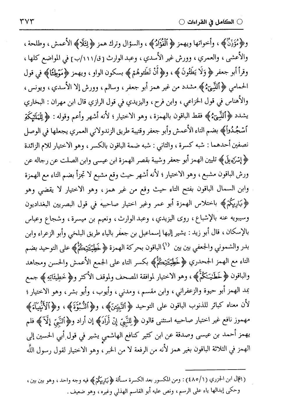 و (مُؤَذِّنٌ)، وأخواتها ويهمز (الْفُؤَادُ)، والسؤال وترك همز (لِئَلَّا) الْأَعْمَش، وطَلْحَة، والأعشى، والْعُمَرِيّ، وورش غير الأسدي، وعبد الوارث في المواضع كلها، وقرأ أبو جعفر (وَلَا يَطَئُونَ)، و (أَنْ تَطَئُوهُمْ) بسكون الواو، ويهمز (مَوْطِئًا) في قول الْحَمَّامِيّ (النَّسِيءُ) مشدد من غير همز أبو جعفر، وسالم، وورش إلا الأسدي، ويونس، والأهناس في قول الْخُزَاعِيّ، وابن فرح، والْيَزِيدِيّ في قول الرَّازِيّ قال ابن مهران: البخاري يشدد (النَّسِيءُ) فقط الباقون بالهمزة، وهو الاختيار؛ لأنه أشهر وأعم وقوله: (لِلْمَلَائِكَةِ اسْجُدُوا) بضم التاء الْأَعْمَش وأبو جعفر وقُتَيْبَة طريق الزندولاني الْعُمَرِيّ يجعلها في الوصل نصفين أحدهما: شبه كسرة، والثاني: شبه ضمة الباقون بالكسر، وهو الاختيار للام الزائدة (إِسْرَائِيلَ) تليين الهمز أبو جعفر وشيبة بقصر الهمزة ابن عيسى وابْن الصَّلْتِ عن رجاله عن ورش الباقون مشبع، وهو الاختيار؛ لأنه أشهر حيث وقع مشبع لا تجزأ بضم التاء مع الهمزة وابن السَّمَّال الباقون بفتح التاء حيث وقع من غير همز، وهو الاختيار لا يقضي وهو (بَارِئِكُمْ) باختلاس الهمزة أبو عمر وغير اختيار صاحبيه في قول البصريين البغداديون وسيبويه عنه بالإشباع، روى الْيَزِيدِيّ، وعبد الوارث، ونعيم بن ميسرة، وشجاع وعباس بالإسكان، قال أبو زيد: يشير إليها إسماعيل بن جعفر بالياء طريق الْبَلْخِيّ وأبو الزعراء وابن بدر والشموني والجعفي بين بين، الباقون بحركة الهمزة (خَطِيئَاتِكُمْ) على التوحيد بضم التاء مع الهمز الْجَحْدَرِيّ (خَطِيئَاتِكُمْ) بكسر التاء على الجمع الْأَعْمَش والحسن ومجاهد والباقون (خَطَايَاكُمْ)، وهو الاختيار لموافقة المصحف ولموقف الأكثر و (خَطِيئَاتُهُ) جمع بمد الهمز أبو حيوة والزَّعْفَرَانِيّ، وابْن مِقْسَمٍ، ومدني، وأيوب، وأبو بشر، وهو الاختيار؛ لأن معناه كبائر للذنوب الباقون على التوحيد (النَّبِيِّينَ)، و (النُّبُوَّةَ)، و (الْأَنْبِيَاءَ) مهموز نافع غير اختيار صاحبيه استثنى قَالُون (لِلنَّبِيِّ إِنْ أَرَادَ) إن أراد و (النَّبِيِّ إِلَّا) فلم يهمز أحمد بن عيسى وصدقة عن ابْن كَثِيرٍ كنافع الهاشمي يشير في قول أبي الحسين إلى الهمز في الثلاثة الباقون بغير همز لأنه من الرفعة لا من الخبر، وهو الاختيار لقول رسول اللَّه - صلى الله عليه وسلم -: