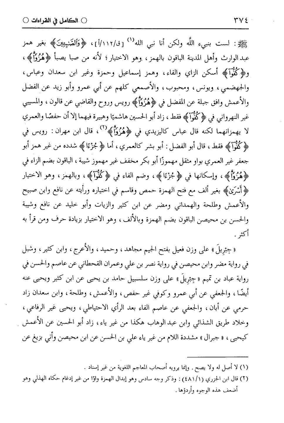 لست بنبيء اللَّه ولكن أنا نبي الله (¬1)، (وَالصَّابِئِينَ) بغير همز عبد الوارث وأهل المدينة الباقون بالهمز، وهو الاختيار، لأنه من صبا يصبأ (هُزُوًا)، و (كُفُوًا) أسكن الزاي والفاء، وهمز إسماعيل وحَمْزَة وغير ابْن سَعْدَانَ وعباس، والجهضمي، ويونس، ومحبوب، والأصمعي كلهم عن أَبِي عَمْرٍو وأبو زيد عن الفضل والْأَعْمَش وافق جبلة عن المفضل في (هُزُوًا) رُوَيْس وَرَوْحٌ والقاضي عن قَالُون، والْمُسَيَّبِيّ غير النهرواني في (كفوا) فقط، زاد أبو الحسين هاشميًا وهبيرة فيهما إلا أن حفضا والْعُمَرِيّ لا يهمزانهما لكنه قال عباس كالْيَزِيدِيّ في (هُزُوًا)، قال ابن مهران: رُوَيْس في (كُفُوًا) فقط، قال أبو الفضل: أبو بشر كالْعُمَرِيّ، أما (جُزْءًا) شدده من غير همز أبو جعفر غير الْعُمَرِيّ بواو مثقل مهموزًا أبو بكر مخفف غير مهموز شيبة، الباقون بضم الزاء في (هُزُوا)، وإسكانها في (جُزْءًا)، وضم الفاء في (كُفُوًا)، وبالهمز، وهو الاختيار (أَسْرَى) بغير ألف مع فتح الهمزة حمص وقاسم في اختياره ورأيته عن نافع وابن صبيح والْأَعْمَش وطَلْحَة والهمداني ومضر عن ابْن كَثِيرٍ والزَّيَّات وأبو خليد عن نافع وشيبة والحسن بن مُحَيْصِن الباقون بضم الهمزة وبالألف، وهو الاختيار بزيادة حرف ومن قرأ به أكثر.