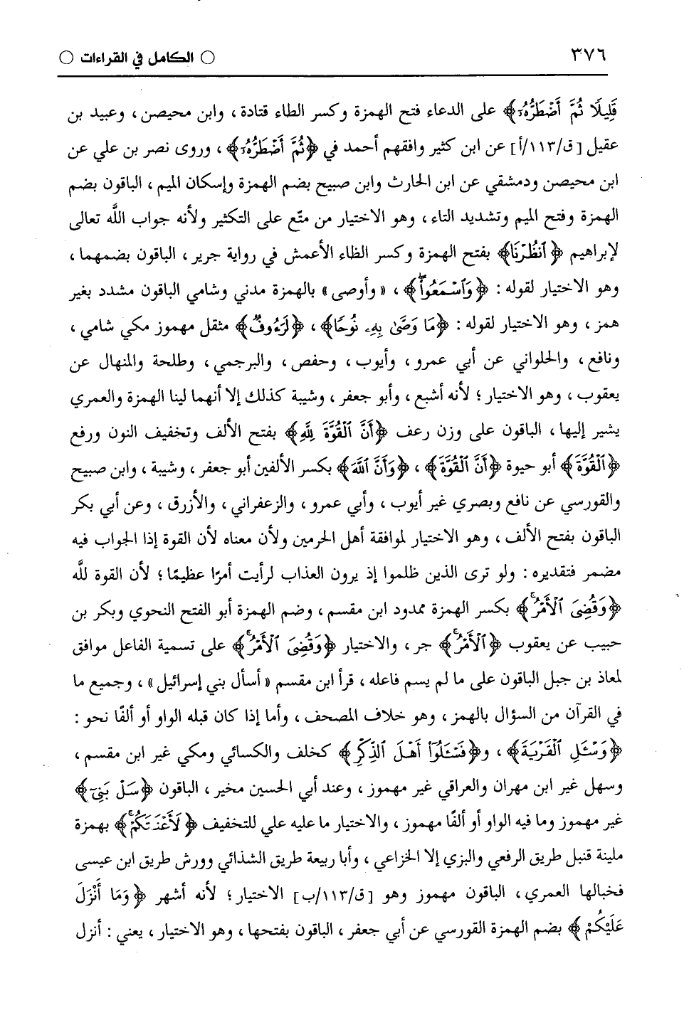 قَلِيلًا ثُمَّ أَضْطَرُّهُ) على الدعاء فتح الهمزة وكسر الطاء قَتَادَة، وابن مُحَيْصِن، وعبيد بن عقيل عن ابْن كَثِيرٍ وافقهم أحمد في (ثُمَّ أَضْطَرُّهُ)، وروى نصر بن علي عن ابن مُحَيْصِن ودمشقي عن ابن الحارث وابن صبيع بضم الهمزة وإسكان الميم، الباقون بضم الهمزة وفتح الميم وتشديد التاء، وهو الاختيار من متَّع على التكثير ولأنه جواب اللَّه تعالى لإبراهيم (انْظُرْنَا) بفتح الهمزة وكسر الظاء الْأَعْمَش في رواية جرير، الباقون بضمهما، وهو الاختيار لقوله: (وَاسْمَعُوا)، " وأوصى " بالهمزة مدني وشامي الباقون مشدد بغير همز، وهو الاختيار لقوله: (مَا وَصَّى بِهِ نُوحًا)، (لَرَءُوف) مثقل مهموز مكي شامي، ونافع، والحلواني عن أَبِي عَمْرٍو، وأيوب، وحفص، والبرجمي، وطَلْحَة والمنهال عن يَعْقُوب، وهو الاختيار، لأنه أشبع، وأبو جعفر، وشيبة كذلك إلا أنهما لينا الهمزة والْعُمَرِيّ يشير إليها، الباقون على وزن رعف (أَنَّ الْقُوَّةَ لِلَّهِ) بفتح الألف وتخفيف النون ورفع (الْقُوَّةَ) أبو حيوة (أَنَّ الْقُوَّةَ)، (وَأَنَّ اللَّهَ) بكسر الألفين أبو جعفر، وشيبة، وابن صبيح والقورسي عن نافع وبصري غير أيوب، وأَبِي عَمْرٍو، والزَّعْفَرَانِيّ، والأزرق، وعن أبي بكر الباقون بفتح الألف، وهو الاختيار لموافقة أهل الحرمين ولأن معناه لأن القوة إذا الجواب فيه مضمر فتقديره: ولو ترى الذين ظلموا إذ يرون العذاب لرأيت أمرًا عظيمًا، لأن القوة للَّه (وَقُضِيَ الْأَمْرُ) بكسر الهمزة ممدود ابْن مِقْسَمٍ، وضم الهمزة أبو الفتح النحوي وبكر بن حبيب عن يَعْقُوب (الْأَمْرُ) جر، والاختيار (وَقُضِيَ الْأَمْرُ) على تسمية الفاعل موافق لمعاذ بن جبل الباقون على ما لم يسم فاعله، قرأ ابْن مِقْسَمٍ " أسأل بني إسرائيل "، وجميع ما في القرآن من السؤال بالهمز، وهو خلاف المصحف، وأما إذا كان قبله الواو أو ألفًا نحو: (وَاسْأَلِ الْقَرْيَةَ)، و (فَاسْأَلُوا أَهْلَ الذِّكْرِ) كخلف والكسائي ومكي غير ابْن مِقْسَمٍ، وسهل غير ابن مهران والعراقي غير مهموز، وعند أبي الحسين مخير، الباقون (سَلْ بَنِي) غير مهموز وما فيه الواو أو ألفا مهموز، والاختيار ما عليه علي للتخفيف (لَأَعْنَتَكُمْ) بهمزة ملينة قُنْبُل طريق الرفعي والبزي إلا الْخُزَاعِيّ، وأبا ربيعة طريق الشَّذَائِيّ وورش طريق ابن عيسى فخبالها الْعُمَرِيّ، الباقون مهموز وهو الاختيار؛ لأنه أشهر (وَمَا أَنْزَلَ عَلَيْكُمْ) بضم الهمزة القورسي عن أبي جعفر، الباقون بفتحها، وهو الاختيار، يعني: أنزل