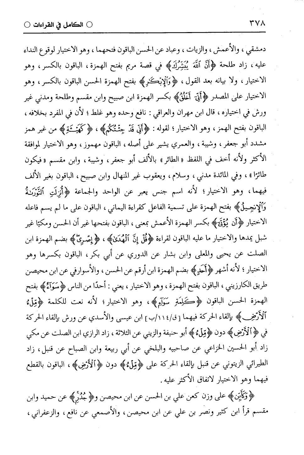 دمشقي، والْأَعْمَش، والزَّيَّات، وعباد عن الحسن الباقون فتحهما، وهو الاختيار لوقوع النداء عليه، زاد طَلْحَة (أَنَّ اللَّهَ يُبَشِّرُكَ) في قصة مريم بفتح الهمزة، الباقون بالكسر، وهو الاختيار، ولا بيانه بعد القول، (وَالْإِبْكَارِ) بفتح الهمزة الحسن الباقون بالكسر، وهو الاختيار على المصدر (أَنِّي أَخْلُقُ) بكسر الهمزة ابن صبيح وابْن مِقْسَمٍ وطَلْحَة ومدني غير ورش في اختياره، قال ابن مهران والعراقي نافع وحده وهو غلط؛ لأن في المفرد بخلافه، الباقون بفتح الهمز، وهو الاختيار؛ لقوله: (أَنِّي قَدْ جِئْتُكُمْ)، (كَهَيْئَةِ) من غير همز مشدد أبو جعفر، وشيبة، والْعُمَرِيّ يشير على أصله، الباقون مهموز، وهو الاختيار لموافقة الأكثر ولأنه أخف في اللفظ " الطائر " بالألف أبو جعفر، وشيبة، وابْن مِقْسَمٍ " فيكون طائرًا "، وفي المائدة مدني، وسلام، ويَعْقُوب غير المنهال وابن صبيح، الباقون بغير الألف فيهما، وهو الاختيار؛ لأنه اسم جنس يعبر عن الواحد والجماعة (أُنْزِلَتِ التَّوْرَاةُ وَالْإِنْجِيلُ) بفتح الهمزة على تسمية الفاعل كقراءة اليماني، الباقون على ما لم يسم فاعله الاختيار (أَنْ يُؤْتَى) بكسر الهمزة الْأَعْمَش بمعنى، الباقون بفتحها غير أن الحسن ومكيًّا غير شِبْل يمدها والاختيار ما عليه الباقون لقراءة (قُلْ إِنَّ الْهُدَى)، (إِصْرِي) بضم الهمزة ابن الصلت عن يحيى والْمُعَلَّى وابن بشار عن الدُّورِيّ عن أبي بكر، الباقون بكسرها وهو الاختيار؛ لأنه أشهر (أَحَدٍ) بضم الهمزة ابن أرقم عن الحسن، والأسوارفي عن ابن مُحَيْصِن طريق الْكَارَزِينِيّ، الباقون بفتح الهمزة، وهو الاختيار، يعني: أحدًا من الناس (سَوَآءٌ) بفتح الهمزة الحسن الباقون (كَلِمَةٍ سَوَاءٍ)، وهو الاختيار؛ لأنه نعت للكلمة (مِلْءُ الْأَرْضِ) بإلقاء الحركة فيهما ابن عيسى والأسدي عن ورش بإلقاء الحركة في (الْأَرْضِ) دون (مِلْءُ) أبو حنيفة والزَّيْنَبِيّ عن الثلاثة، زاد الرَّازِيّ ابْن الصَّلْتِ عن مكي زاد أبو الحسين الْخُزَاعِيّ عن صاحبيه والْبَلْخِيّ عن أبي ربيعة وابْن الصَّبَّاحِ عن قُنْبُل، زاد الطَّيْرَائِيِّ الزيتوني عن قُنْبُل بإلقاء الحركة على (مِلْءُ) دون (الْأَرْضِ)، الباقون بالقطع فيهما وهو الاختيار لاتفاق الأكثر عليه.
