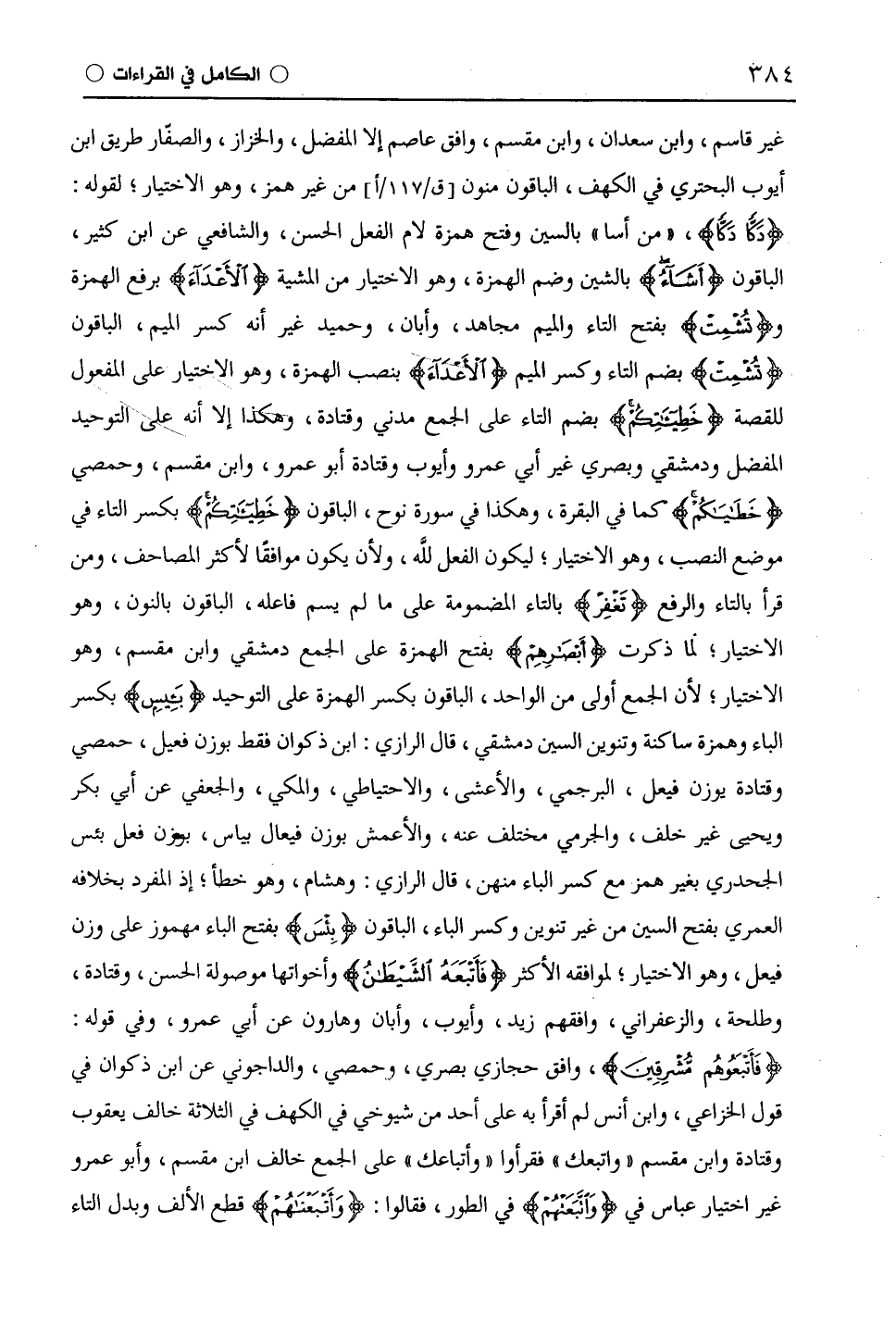 غير قاسم، وابْن سَعْدَانَ، وابْن مِقْسَمٍ، وافق عَاصِم إلا المفضل، والخزاز، والصفار طريق ابن أيوب البحتري في الكهف، الباقون منون من غير همز، وهو الاختيار؛ لقوله: (دَكًّا دَكًّا)، (من أسا! بالسين وفتح همزة لام الفعل الحسن، والشافعي عن ابْن كَثِيرٍ، الباقون (أَشَآءُ) بالشمين وضم الهمزة، وهو الاختيار من المشيئة (الْأَعْدَاءَ) برفع الهمزة و (تُشْمِتْ) بفتح التاء والميم مجاهد، وأبان، وَحُمَيْد غير أنه كسر الميم، الباقون (تُشْمِتْ) بضم التاء وكسر الميم (الْأَعْدَاءَ) بنصب الهمزة، وهو الاختيار على المفعول للقصة (خَطِيئَاتِكُمْ) بضم التاء على الجمع مدني وقَتَادَة، وهكذا إلا أنه على التوحيد المفضل ودمشقي وبصري غير أَبِي عَمْرٍو وأيوب وقَتَادَة أَبُو عَمْرٍو، وابْن مِقْسَمٍ، وحمصي (خَطَايَاكُمْ) كما في البقرة، وهكذا في سورة نوح، الباقون (خَطِيئَاتِهِمْ) بكسر التاء في موضع النصب، وهو الاختيار؛ ليكون الفعل للَّه، ولأن يكون موافقا لأكثر المصاحف، ومن قرأ بالتاء والرفع (تَغفِر) بالتاء المضمومة على ما لم يسم فاعله، الباقون بالنون، وهو الاختيار؛ لما ذكرت (أَبْصَارِهِمْ) بفتح الهمزة على الجمع دمشقي وابْن مِقْسَمٍ، وهو الاختيار؛ لأن الجمع أولى من الواحد، الباقون بكسر الهمزة على التوحيد (بَئِيسٍ) بكسر الباء وهمزة ساكنة وتنوين السين دمشقي، قال الرَّازِيّ: ابْن ذَكْوَانَ فقط بوزن فعيل، حمصي وقَتَادَة يوزن فيعل، البرجمي، والأعشى، والاحتياطي، والمكي، والجعفي عن أبي بكر ويحيى غير خلف، والجرمي مختلف عنه، والْأَعْمَش بوزن فيعال بياس، بوزن فعل بئس الْجَحْدَرِيّ بغير همز مع كسر الباء منهن، قال الرَّازِيّ: وهشام، وهو خطأ؛ إذ المفرد بخلافه الْعُمَرِيّ بفتح السين من غير تنوين وكسر الباء، الباقون (بَئْسٍ) بفتح الباء مهموز على وزن فيعل، وهو الاختيار؛ لموافقه الأكثر (فَأَتْبَعَهُ الشَّيْطَانُ) وأخواتها موصولة الحسن، وقَتَادَة، وطَلْحَة، والزَّعْفَرَانِيّ، وافقهم زيده، وأيوب، وأبان وهارون عن أَبِي عَمْرٍو، وفي قوله: (فَأَتْبَعُوهُمْ مُشْرِقِينَ)، وافق حجازي بصري،، حمصي، والدَّاجُونِيّ عن ابْن ذَكْوَانَ في قول الْخُزَاعِيّ، وابن أنس لم أقرأ به على أحد من شيوخي في الكهف في الثلاثة خالف يعقوب وقَتَادَة وابْن مِقْسَمٍ " واتبعك " فقرأوا " وأتباعك " على الجمع خالف ابْن مِقْسَمٍ، وأَبُو عَمْرٍو غير اختيار عباس في (وَاتَّبَعَتْهُمْ) في الطور، فقالوا: (وَأَتَّبَعْنَاهُمْ) قطع الألف وبدل التاء