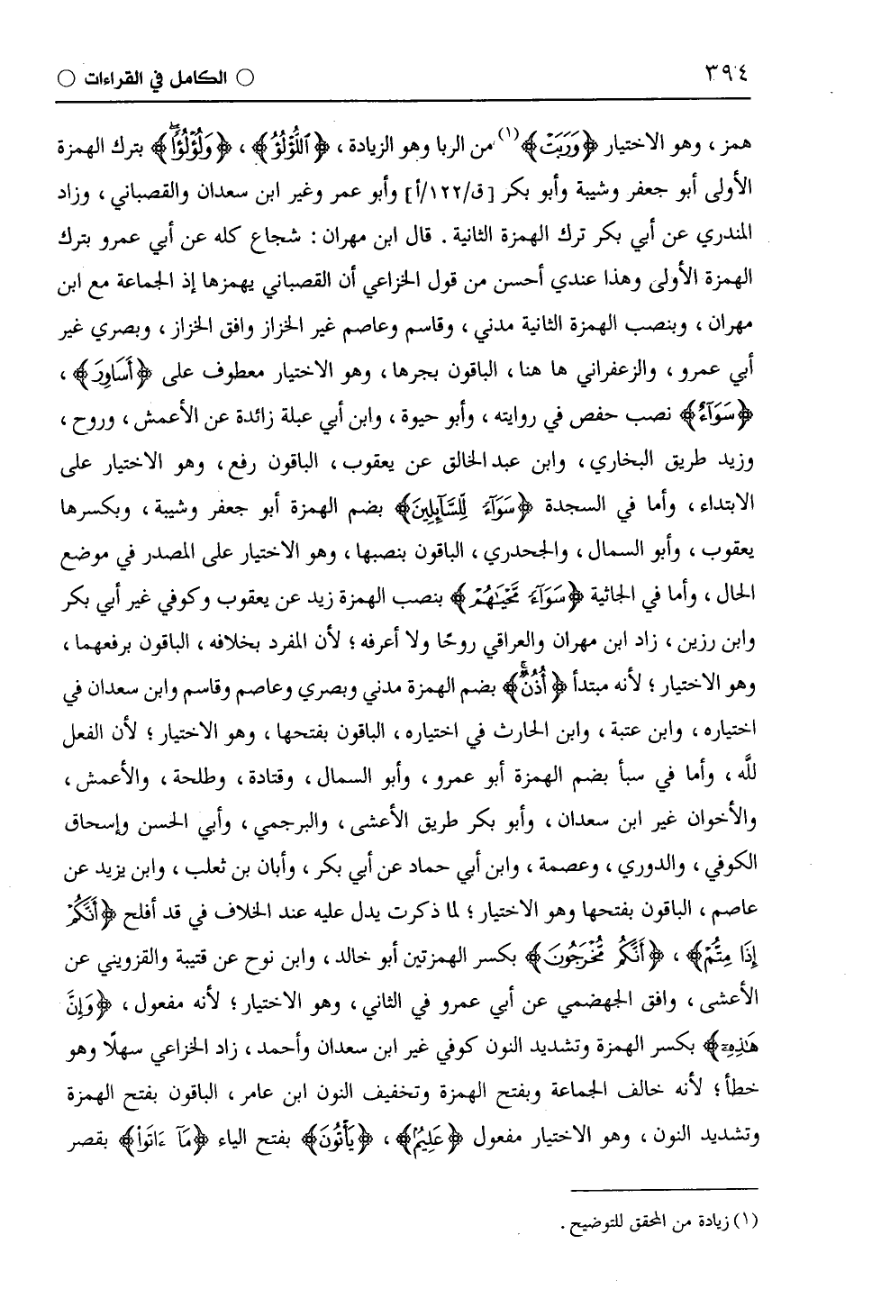 همز، وهو الاختيار (وَرَبَت) من الربا وهو الزيادة، (اللؤلُؤُ)، (وَلُؤلؤا) بترك الهمزة الأولى أبو جعفر وشيبة وأبو بكر وأبو عمر وغير ابْن سَعْدَانَ والقصباني، وزاد المندري عن أبي بكر ترك الهمزة الثانية. قال ابن مهران: شجاع كله عن أَبِي عَمْرٍو بترك الهمزة الأولى وهذا عندي أحسن من قول الْخُزَاعِيّ أن القصباني يهمزها إذ الجماعة مع ابن مهران، وبنصب الهمزة الثانية مدني، وقاسم وعَاصِم غير الخزاز وافق الخزاز، وبصري غير أَبِي عَمْرٍو، والزَّعْفَرَانِيّ ها هنا، الباقون بجرها، وهو الاختيار معطوف على (أَسَاوِرَ)، (سَوَآءٌ) نصب حفص في روايته، وأبو حيوة، وابن أبي عبلة زائدة عن الْأَعْمَش، وَرَوْحٌ، وزيد طريق البخاري، وابن عبد الخالق عن يَعْقُوب، الباقون رفع، وهو الاختيار على الابتداء، وأما في السجدة (سَوَاءً لِلسَّائِلِينَ) بضم الهمزة أبو جعفر وشيبة، وبكسرها يَعْقُوب، وأبو السَّمَّال، والْجَحْدَرِيّ، الباقون بنصبها، وهو الاختيار على المصدر في موضع الحل، وأما في الثانية (سَوَاءً مَحْيَاهُمْ) بنصب الهمزة زيد عن يَعْقُوب وكوفي غير أبي بكر وابن رزين، زاد ابن مهران والعراقي روحًا ولا أعرفه؛ لأن المفرد بخلافه، الباقون برفعهما، وهو الاختيار؛ لأنه مبتدأ (أُذُنٌ) بضم الهمزة مدني وبصري وعَاصِم وقاسم وابْن سَعْدَانَ في اختياره، وابن عتبة، وابن الحارث في اختياره، الباقون بفتحها، وهو الاختيار؛ لأن الفعل للَّه، وأما في سبأ بضم الهمزة أَبُو عَمْرٍو، وأبو السَّمَّال، وقَتَادَة، وطَلْحَة، والْأَعْمَش، والأخوان غير ابْن سَعْدَانَ، وأبو بكر طريق الأعشى، والبرجمي، وأبي الحسن وإسحاق الكوفي، والدُّورِيّ، وعصمة، وابن أبي حماد عن أبي بكر، وأبان بن ثعلب، وابن يزيد عن عَاصِم، الباقون بفتحها وهو الاختيار؛ لما ذكرت يدل عليه عند الخلاف في قد أفلح (أَنَّكُمْ إِذَا مِتُّمْ، (أَنَّكُمْ مُخْرَجُونَ) بكسر الهمزتين أبو خالد، وابن نوح عن قُتَيْبَة والقزويني عن الأعشى، وافق الجهضمي عن أَبِي عَمْرٍو في الثاني، وهو الاختيار؛ لأنه مفعول، (وَإِنَّ هذِهِ) بكسر الهمزة وتشديد النون كوفي غير ابْن سَعْدَانَ وأحمد، زاد الْخُزَاعِيّ سهلًا وهو خطأ، لأنه خالف الجماعة وبفتح الهمزة وتخفيف النون ابن عامر، الباقون بفتح الهمزة وتشديد النون، وهو الاختيار مفعول (عَلِيمٌ)، (يُؤْتُونَ) بفتح الياء (مَا آتَوْا) بقصر