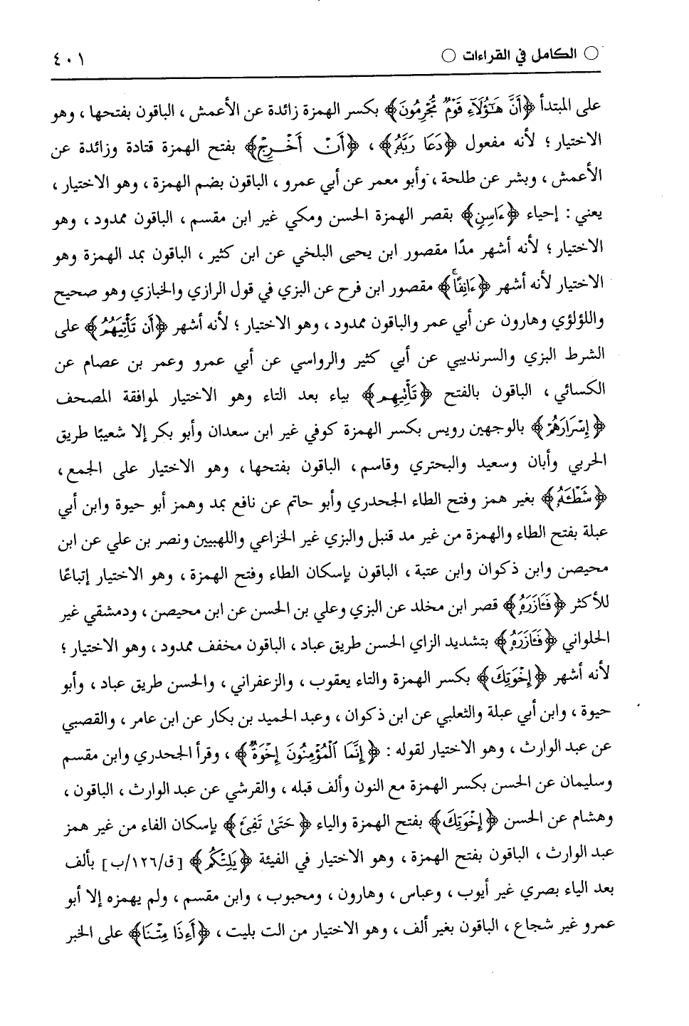 على المبتدأ (أَنَّ هَؤُلَاءِ قَوْمٌ مُجْرِمُونَ) بكسر الهمزة زائدة عن الْأَعْمَش، الباقون بفتحها، وهو الاختيار، لأنه مفعول (فَدَعَا رَبَّهُ)، (أَنْ أُخْرَجَ) بفتح الهمزة قَتَادَة وزائدة عن الْأَعْمَش، وبشر عن طَلْحَة، وأبو معمر عن أَبِي عَمْرٍو، الباقون بضم الهمزة، وهو الاختيار، يعني: إحياء (ءَاسِنٍ) بقصر الهمزة الحسن ومكي غير ابْن مِقْسَمٍ، الباقون ممدود، وهو الاختيار، لأنه أشهر مدًّا مقصور ابن يحيى الْبَلْخِيّ عن ابْن كَثِيرٍ، الباقون بمد الهمزة وهو الاختيار لأنه أشهر (ءَانِفًا) مقصور ابن فرح عن البزي في قول الرَّازِيّ والْخَبَّازِيّ وهو صحيح واللؤلؤي وهارون عن أبي عمر والباقون ممدود، وهو الاختيار؛ لأنه أشهر (أَنْ تَأْتِهُمْ) على الشرط البزي والسرنديبي عن أبي كثير والرواسي عن أَبِي عَمْرٍو وعمر بن عصام عن الكسائي، الباقون بالفتح (تَأْتِيَهُمْ) بياء بعد التاء وهو الاختيار لموافقة المصحف (إِسْرَارَهُمْ) بالوجهين رُوَيْس بكسر الهمزة كوفي غير ابْن سَعْدَانَ وأبو بكر إلا شعيبًا طريق الحربي وأبان وسعيد والبحتري وقاسم، الباقون بفتحها، وهو الاختيار على الجمع، (شَطْأَهُ) بغير همز وفتح الطاء الْجَحْدَرِيّ وأَبُو حَاتِمٍ عن نافع بمد وهمز أبو حيوة وابن أي عبلة بفتح الطاء والهمزة من غير مد قُنْبُل والبزي غير الْخُزَاعِيّ واللهبيين ونصر بن علي عن ابن مُحَيْصِن وابْن ذَكْوَانَ وابن عتبة، الباقون بإسكان الطاء وفتح الهمزة، وهو الاختيار اتباعًا للأكثر (فَآزَرَهُ) قصر ابْن مُخَلَّدٍ عن البزي وعلي بن الحسن عن ابن مُحَيْصِن، ودمشقي غير الحلواني (فَأَزَّرَهُ) بتشديد الزاي الحسن طريق عباد، الباقون مخفف ممدود، وهو الاختيار؛ لأنه أشهر (إِخوَتِكُم) بكسر الهمزة والتاء يَعْقُوب، والزَّعْفَرَانِيّ، والحسن طريق عباد، وأبو حيوة، وابن أبي عبلة والثعلبي عن ابْن ذَكْوَانَ، وعبد الحميد بن بكار عن ابن عامر، والقصبي عن عبد الوارث، وهو الاختيار لقوله: (إِنَّمَا الْمُؤْمِنُونَ إِخْوَةٌ)، وقرأ الجحدرى وابْن مِقْسَمٍ وسليمان عن الحسن بكسر الهمزة مع النون وألف قبله، والقرشي عن عبد الوارث، الباقون، وهشام عن الحسن (أَخَوَيْكُمْ) بفتح الهمزة والياء (حَتَّى تَفِيءَ) بإسكان الفاء من غير همز عبد الوارث، الباقون بفتح الهمزة، وهو الاختيار في الفيئة (يَلِتْكُمْ) بألف بعد الياء بصري غير أيوب، وعباس، وهارون، ومحبوب، وابْن مِقْسَمٍ، ولم يهمزه إلا أبو عمرو غير شجاع، الباقون بغير ألف، وهو الاختيار من الت يليت، (أَإِذَا مِتْنَا) على الخبر