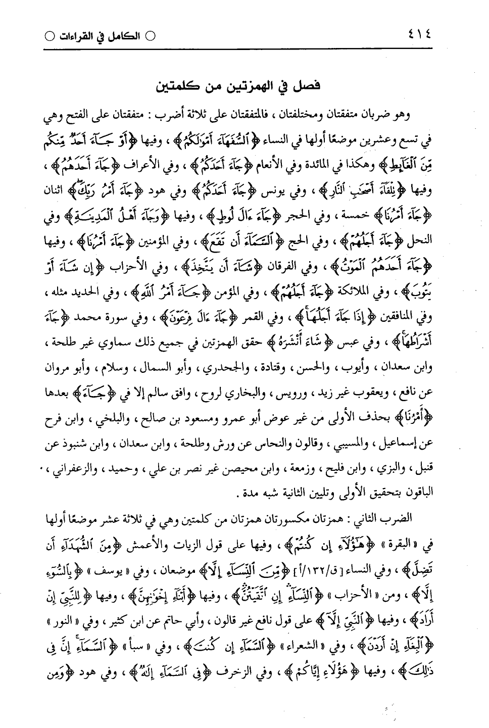وهو ضربان متفقتان ومختلفتان، فالمتفقتان على ثلاث أضرب: متفقتان على الفتح وهي في تسع وعشرين موضعا أولها في النساء {السُّفَهَاءَ أَمْوَالَكُمُ}، وفيها {أَوْ جَاءَ أَحَدٌ مِنْكُمْ مِنَ الْغَائِطِ} وهكذا في المائدة وفي الأنعام {جَاءَ أَحَدَكُمُ}، وفي الأعراف {جَاءَ أَحَدَهُمُ}، وفيها {تِلْقَاءَ أَصْحَابِ النَّارِ}، وفي يونس {جَاءَ أَحَدَكُمُ} وفي هود {جَاءَ أَمْرُ رَبِّكَ} اثنان {جَاءَ أَمْرُنَا} خمسة، وفي الحجر {جَاءَ آلَ لُوطٍ}، وفيها {وَجَاءَ أَهْلُ الْمَدِينَةِ} وفي النحل {جَاءَ أَجَلُهُمْ}، وفي الحج {السَّمَاءَ أَنْ تَقَعَ}، وفي المؤمنين {جَاءَ أَمْرُنَا}، وفيها {جَاءَ أَحَدَهُمُ الْمَوْتُ}، وفي الفرقان {شَاءَ أَنْ يَتَّخِذَ}، وفي الاحزاب {إِنْ شَاءَ أَوْ يَتُوبَ}، وفي الملائكة {جَاءَ أَجَلُهُمْ}، وفي المؤمن {جَاءَ أَمْرُ اللَّهِ}، وفي الحديث مثله، وفي المنافقين {إِذَا جَاءَ أَجَلُهَا}، وفي القمر {جَاءَ آلَ فِرْعَوْنَ}، وفي سورة محمد {جَاءَ أَشْرَاطُهَا}، وفي عبس {شَاءَ أَنْشَرَهُ} حقق الهمزتين في جميع ذلك سماوي غير طلحة، وابن سعدان، وأيوب، والحسن، وقتادة، والجحدري، وأبو السمال، وسلام، وأبو مروان عن نافع، ويعقوب غير زيد، ورويس، والبخاري لروح، وافق سالم إلا في {جَاءَ} بعدها {أَمْرِنَا} بحذف الأولى من غير عوض أبو عمرو ومسعود بن صالح، والبلخي، وابن فرح عن إسماعيل، والمسيبي، وقالون والنحاس عن ورش وطلحة، وابن سعدان، وابن شنبوذ عن قنبل، والبزي، وابن فليح، وزمعة، وابن محيصن غير نصر بن علي، وحميد، والزعفراني، الباقون بتحقيق الأولى وتليين الثانية شبه مدة.
