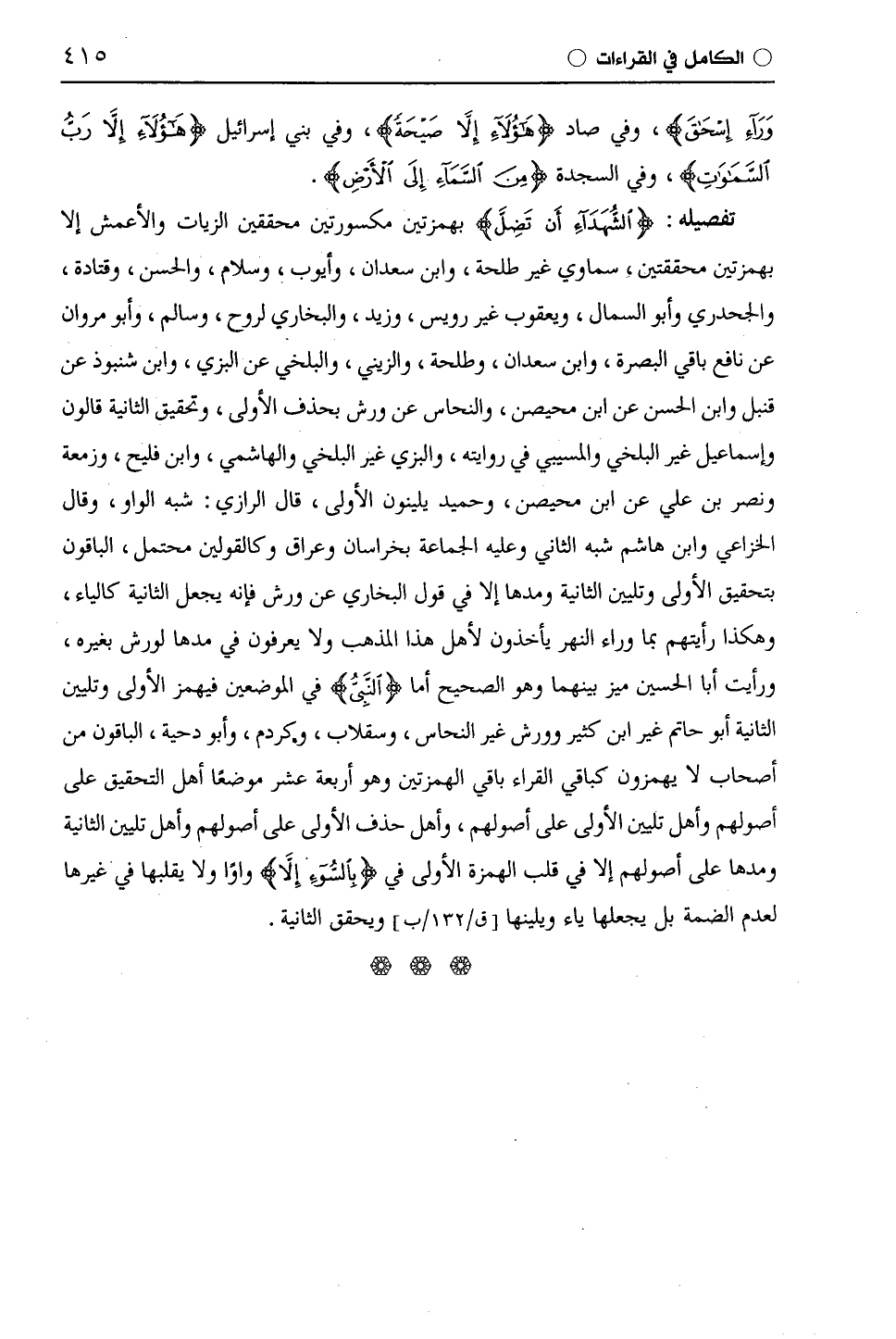تفصيله: (الشُّهَدَاءِ أَنْ تَضِلَّ) بهمزتين مكسورتين محققين الزَّيَّات والْأَعْمَش إلا بهمزتين محققتين، سماوي غير طَلْحَة، وابْن سَعْدَانَ، وأيوب، وسلام، والحسن، وقَتَادَة، والْجَحْدَرِيّ وأبو السَّمَّال، ويَعْقُوب غير رُوَيْس، وزيد، والبخاري لروح، وسالم، وأبو مروان عن نافع باقي البصرة، وابْن سَعْدَانَ، وطَلْحَة، والزَّيْنَبِيّ، والْبَلْخِيّ عن البزي، وابْن شَنَبُوذَ عن قُنْبُل وابن الحسن عن ابن مُحَيْصِن، والنحاس عن ورش بحذف الأولى، وتحقيق الثانية قَالُون وإسماعيل غير الْبَلْخِيّ والْمُسَيَّبِيّ في روايته، والبزي غير الْبَلْخِيّ والهاشمي، وابْن فُلَيْحٍ، وزمعة ونصر بن علي عن ابن مُحَيْصِن، وَحُمَيْد يلينون الأولى، قال الرَّازِيّ: شبه الواو، وقال الْخُزَاعِيّ وابن هاشم شبه الثاني وعليه الجماعة بخراسان وعراق وكالقولين محتمل، الباقون بتحقيق الأولى وتليين الثانية ومدها إلا في قول البخاري عن ورش فإنه يجعل الثانية كالياء، وهكذا رأيتهم بما وراء النهر يأخذون لأهل هذا المذهب ولا يعرفون في مدها لورش بغيره، ورأيت أبا الحسين ميز بينهما وهو الصحيح أما (النَّبِيُّ) في الموضعين فيهمز الأولى وتليين الثانية أَبُو حَاتِمٍ غير ابْن كَثِيرٍ وورش غير النحاس، وسقلاب، وكَرْدَمٌ، وأبو دحية، الباقون من أصحاب لا يهمزون كباقي القراء باقي الهمزتين وهو أربعة عشر موضعًا أهل التحقيق على أصولهم وأهل تليين الأولى على أصولهم، وأهل حذف الأولى على أصولهم وأهل تليين الثانية ومدها على أصولهم إلا في قلب الهمزة الأولى في (بِالسُّوءِ إِلَّا) واوًا ولا يقلبها في غيرها لعدم الضمة بل يجعلها ياء ويلينها ويحقق الثانية.