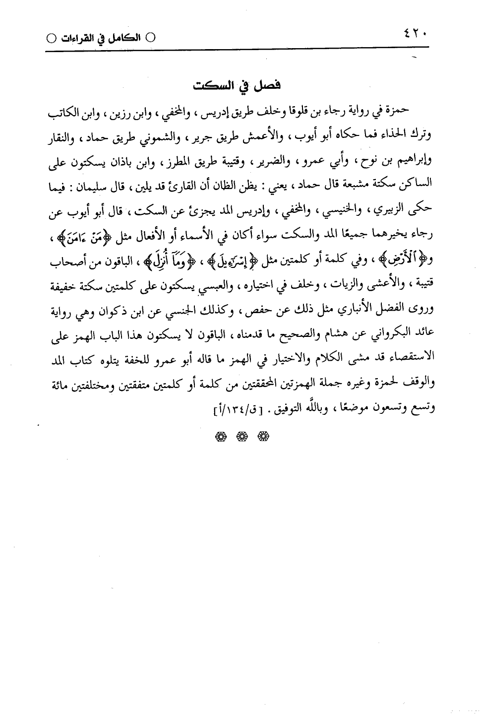 حَمْزَة في رواية رجاء بن قلوقا وخلف طريق إدريس، والمخفي، وابن رزين، وابن الكاتب وترك الحذاء فما حكاه أبو أيوب، والْأَعْمَش طريق جرير، والشموني طريق حماد، والنقار وإبراهيم بن نوح، وأَبِي عَمْرٍو، والضَّرِير، وقُتَيْبَة طريق المطرز، وابن باذان يسكتون على الساكن سكتة مشبعة قال حماد، يعني: يظن الظان أن القارئ قد يلين، قال سليمان: فيما حكى الزبيري، والْخُنَيْسِيّ، والمخفي، وإدريس المد يجزئ عن السكت، قال أبو أيوب عن رجاء يخيرهما جميعًا المد والسكت سواء أكان في الأسماء أو الأفعال مثل (مَنءَامَنَ)، و (الْأَرْضِ)، وفي كلمة أو كلمتين مثل (إِسْرَائِيلَ)، (وَمَا أُنْزِلَ)، الباقون من أصحاب قُتَيْبَة، والأعشى والزَّيَّات، وخلف في اختياره، والْعَبْسِيّ يسكتون على كلمتين سكتة خفيفة وروى الفضل الأنباري مثل ذلك عن حفص، وكذلك الجنسي عن ابْن ذَكْوَانَ وهي رواية عائد البكرواني عن هشام والصحيح ما قدمناه، الباقون لا يسكتون هذا الباب الهمز على الاستقصاء قد مشى الكلام والاختيار في الهمز ما قاله أَبُو عَمْرٍو للخفة يتلوه كتاب المد والوقف لحَمْزَة وغيره جملة الهمزتين المحققتين من كلمة أو كلمتين متفقتين ومختلفتين مائة وتسع وتسعون موضعًا، وباللَّه التوفيق.