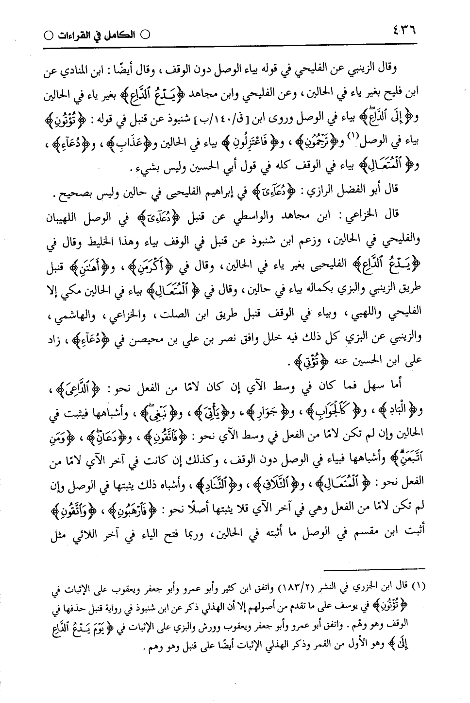 وقال الزينبي عن الفليحي في قوله بياء الوصل دون الوقف، وقال أيضا: ابن المنادي عن ابن فليح بغير ياء في الحالين، وعن الفليحي وابن مجاهد {يَدْعُ الدَّاعِ} بغير ياء في الحالين و {إِلَى الدَّاعِ} بياء في الوصل وروى ابن شنبوذ عن قنبل في قوله: {تُؤْتُونِ} بياء في الوصل و {تَرْجُمُونِ}، و {فَاعْتَزِلُونِ} بياء في الحالين و {عَذَابٌ}، و {دُعَاءً}، و {الْمُتَعَالِ} بياء في الوقف كله في قول أبي الحسين وليس بشيء.