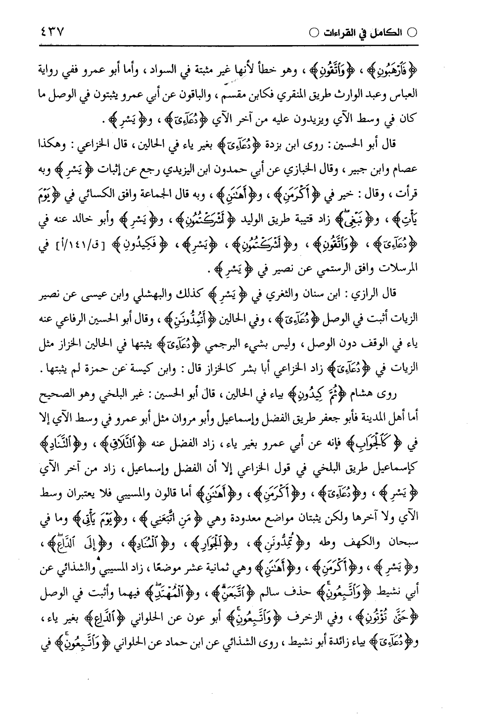 {فَارْهَبُونِ}، {وَاتَّقُونِ}، وهو خطأ لأنها غير مثبتة في السواد، وأما أبو عمرو ففي رواية العباس وعبد الوارث طريق المنقري فكابن مقسم، والباقون عن أبي عمرو يثبتون في الوصل ما كان في وسط الآي ويزيدون عليه من آخر الآي {دُعَائِي}، و {يَسْرِ}.