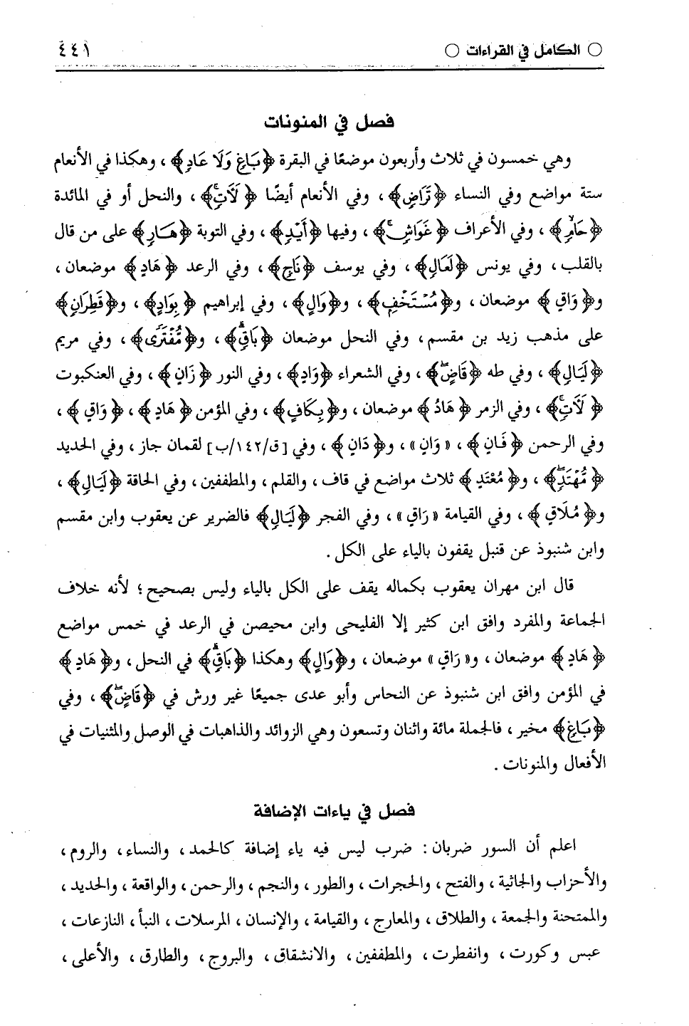 اعلم أن السور ضربان: ضرب ليس فيه ياء إضافة كالحمد، والنساء، والروم، والأحزاب والجاثية، والفتح، والحجرات، والطور، والنجم، والرحمن، والواقعة، والحديد، والممتحنة والجمعة، والطلاق، والمعارج، والقيامة، والإنسان، والمرسلات، النبأ، النازعات، عبس وكورت، وانفطرت، والمطففين، والانشقاق، والبروج، والطارق، والأعلى،