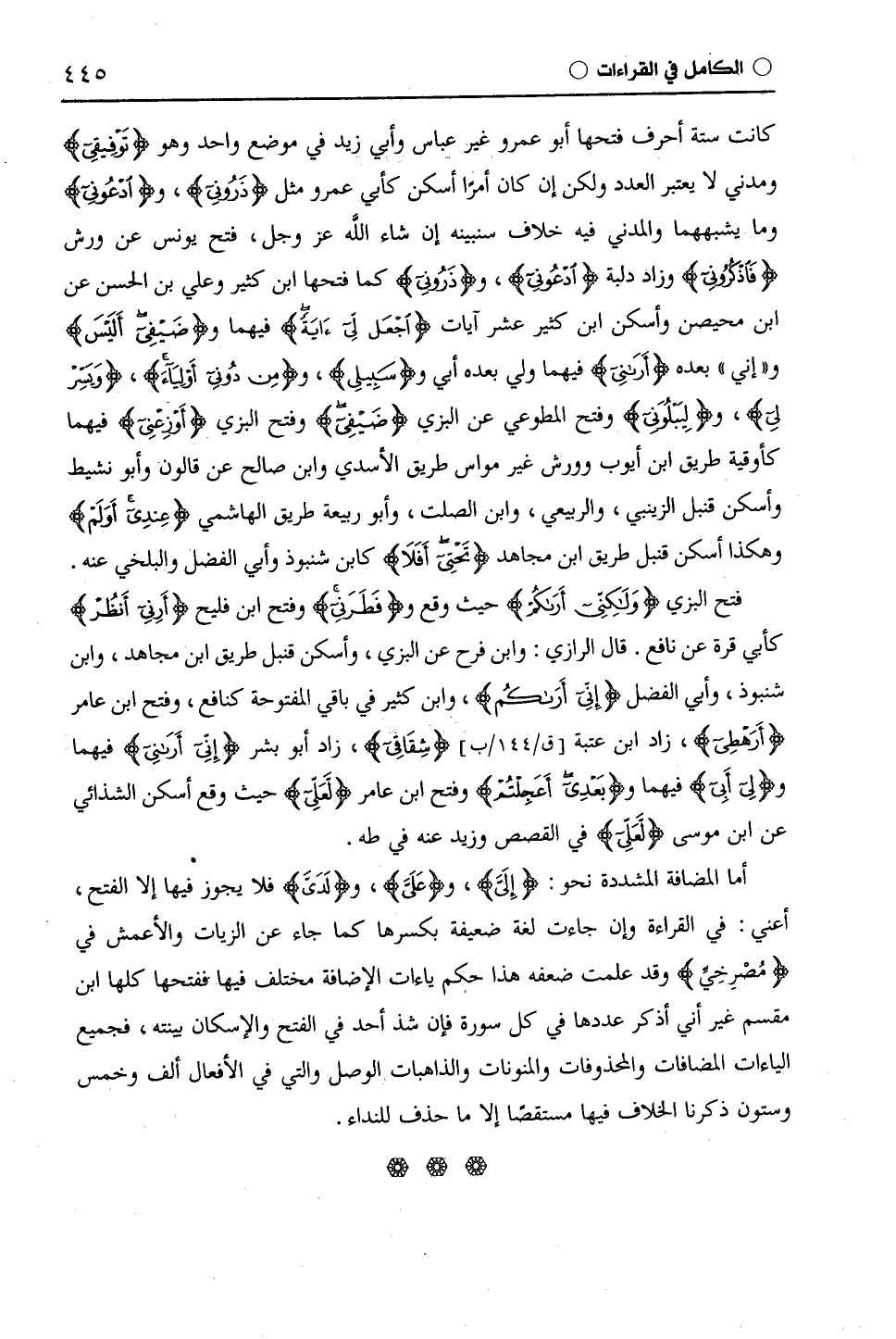 أما المضافة المشددة نحو: {إِلَى}، و {عَلَى}، و {لَدَى} فلا يجوز فيها إلا الفتح، أعني: في القراءة وإن جاءت لغة ضعيفة بكسرها كما جاء عن الزيات والأعمش في {بِمُصْرِخِيَّ} وقد علمت ضعفه هذا حكم ياءات الإضافة مختلف فيها ففتحها كلها ابن مقسم غير أني أذكر عددها في كل سورة فإن شذ أحد في الفتح والإسكان بينته، فجميع الياءات المضافات والمحذوفات والمنونات والذاهبات الوصل والتي في الأفعال ألف وخمس وستون ذكرنا الخلاف فيها مستقصا إلا ما حذف للنداء.