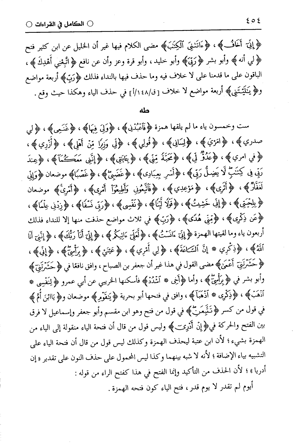 ست وخمسون ياء ما لم يلقها همزة {فَاعْبُدْنِي}، {وَلِيَ فِيهَا}، {غَنَمِي}، {لِي صَدْرِي}، {أَمْرِي}، {لِسَانِي}، {قَوْلِي}، {لِي وَزِيرًا مِنْ أَهْلِي}، {أَزْرِي}، {فِي أَمْرِي}، {عَدُوٌّ لِي}، {مَحَبَّةً مِنِّي}، {بِآيَاتِي}، {إِنَّنِي مَعَكُمَا}، {عِنْدَ رَبِّي فِي كِتَابٍ لَا يَضِلُّ رَبِّي}، {أَسْرِ بِعِبَادِي}، {غَضَبِي}، {غَضَبِي} موضعان {وَإِنِّي لَغَفَّارٌ}، {أَثَرِي}، {مَوْعِدِي}، {فَاتَّبِعُونِي وَأَطِيعُوا أَمْرِي}، {أَمْرِي} موضعان {بِلِحْيَتِي}، {إِنِّي خَشِيتُ}، {قَوْلًا لَيِّنًا}، {نَفْسِي}، {رَبِّي نَسْفًا}، {زِدْنِي عِلْمًا}، {عَنْ ذِكْرِي}، {مِنِّي هُدًى}، {رَبِّ} في ثلاث مواضع حذفت منها إلا للنداء فذلك أربعون ياء وما لقيتها الهمزة {إِنِّي آنَسْتُ}، {لَعَلِّي آتِيكُمْ}، {إِنِّي أَنَا رَبُّكَ}، {إِنَّنِي أَنَا اللَّهُ}، {لِذِكْرِي (14) إِنَّ السَّاعَةَ}، {لِي أَمْرِي}، {عَيْنِي}، {بِرَأْسِي}، {إِنِّي}، {حَشَرْتَنِي أَعْمَى} مضى القول في هذا غير أن جعفر بن الصباح، وافق نافعا في {حَشَرْتَنِي} وأبو بشر في {بِرَأْسِي}، وأما {أَخِي (30) اشْدُدْ} فأسكنها الخريبي عن أبي عمرو {لِنَفْسِي (41) اذْهَبْ}، {ذِكْرِي (42) اذْهَبَا}، وافق في فتحها أبو بحرية {يَا قَوْمِ} موضعان و {يا ابن أم} في قول من كسر {تَتَّبِعَنِ} في قول من فتح وهو ابن مقسم وأبو جعفر وإسماعيل لا فرق بين الفتح والحركة في {إِنْ أَدْرِي} وليس قول من قال أن فتحة الياء منقولة إلى الياء من الهمزة بشيء؛ لأن ابن عتبة ليحذف الهمزة وكذلك ليس قول من قال أن فتحة الياء على التشبيه بياء الإضافة؛ لأنه لا شبه بينهما وكذا ليس المحمول على حذف النون على تقدير "إن أدريا"؛ لأن الحذف من التأكيد وإنما الفتح في هذا كفتح الراء من قوله: