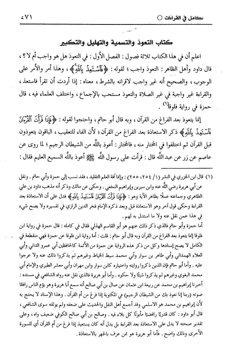اعلم أن في هذا الكتاب ثلاثة فصول: الفصل الأول: في التعوذ هل هو واجب أم لا؟، قال داود وأهل الظاهر: التعوذ واجب؛ لقوله: (فَاسْتَعِذْ بِاللَّهِ)، وهذا أمر والأمر على الوجوب، والصحيح أنه غير واجب لإقرانه بالشرط، معناه: إذا أردت أن تقرأ فاستعذ، والقراءة غير واجبة في غير الصلاة والتعوذ مستحب بالإجماع، واختلف العلماء فيه، قال حَمْزَة في رواية ابن قلوقا.