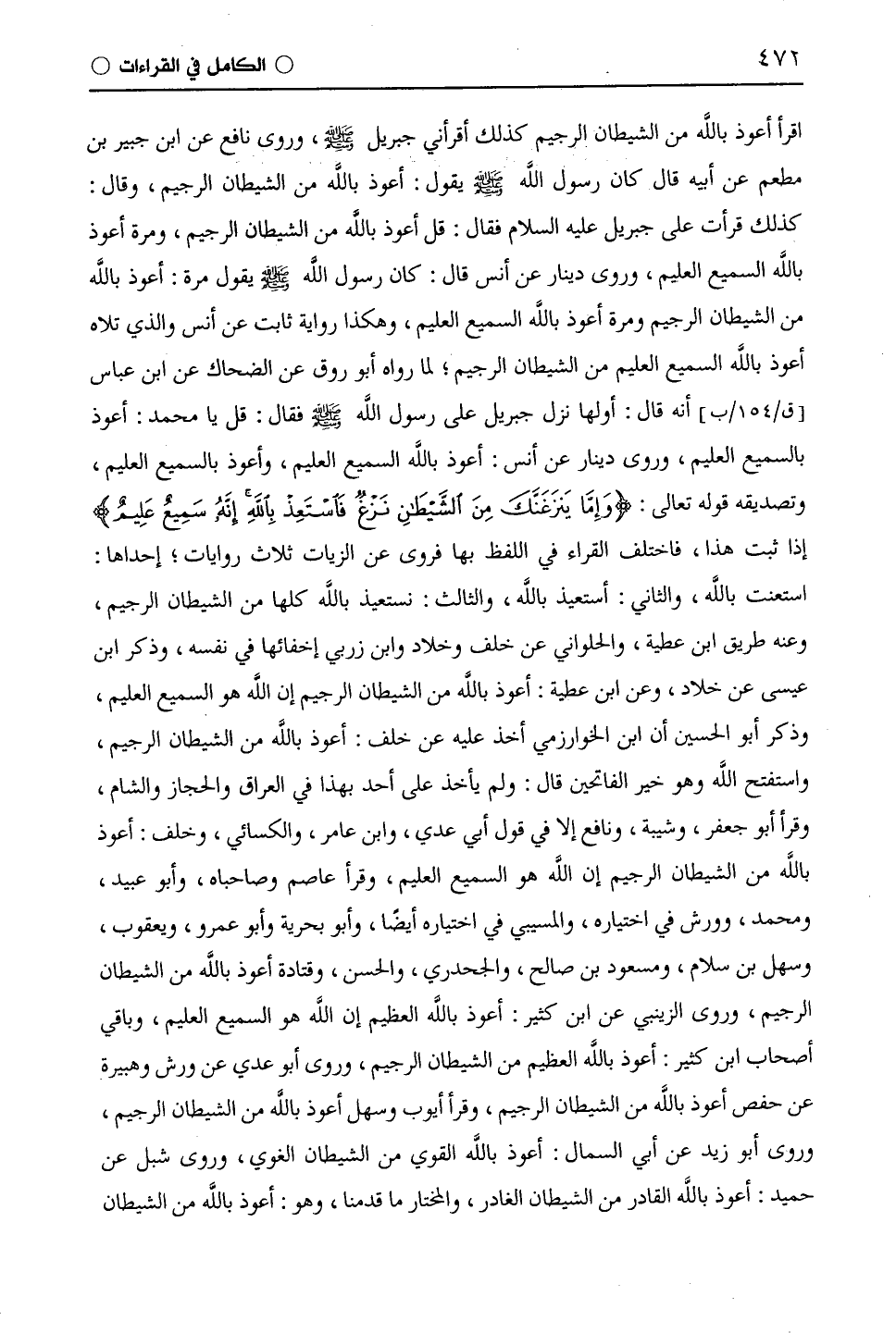 اقرأ أعوذ بِاللَّهِ من الشيطان الرجيم كذلك أقرأني جبريل - صلى الله عليه وسلم -، وروى نافع عن ابن جبير بن مطعم عن أبيه قال كان رسول اللَّه - صلى الله عليه وسلم - يقول: أعوذ بِاللَّهِ من الشيطان الرجيم، وقال: كذلك قرأت على جبريل عليه السلام فقال: قل أعوذ بِاللَّهِ من الشيطان الرجيم، ومرة أعوذ بِاللَّهِ السميع العليم، وروى دينار عن أنس قال: كان رسول اللَّه - صلى الله عليه وسلم - يقول مرة: أعوذ باللَّه من الشيطان الرجيم ومرة أعوذ بِاللَّهِ السميع العليم، وهكذا رواية ثابت عن أنس والذي تلاه أعوذ بِاللَّهِ السميع العليم من الشيطان الرجيم؛ لما رواه أبو روق عن الضحاك عن ابن عباس أنه قال: أولها نزل جبريل على رسول اللَّه - صلى الله عليه وسلم - فقال: قل يا محمد: أعوذ بالسميع العليم، وروى دينار عن أنس: أعوذ بِاللَّهِ السميع العليم، وأعوذ بالسميع العليم، وتصديقه قوله تعالى: (وَإِمَّا يَنْزَغَنَّكَ مِنَ الشَّيْطَانِ نَزْغٌ فَاسْتَعِذْ بِاللَّهِ إِنَّهُ سَمِيعٌ عَلِيمٌ) إذا ثبت هذا، فاختلف القراء في اللفظ بها فروي عن الزَّيَّات ثلاث روايات: إحداها: استعنت بِاللَّهِ، والثاني: أستعيذ بِاللَّهِ، والثالث: نستعيذ بِاللَّهِ كلها من الشيطان الرجيم، وعنه طريق ابن عطية، والحلواني عن خلف وخَلَّاد وابن زربي إخفائها في نفسه، وذكر ابن عيسى عن خَلَّاد، وعن ابن عطية: أعوذ بِاللَّهِ من الشيطان الرجيم إن اللَّه هو السميع العليم، وذكر أبو الحسين أن ابن الخوارزمي أخذ عليه عن خلف: أعوذ بِاللَّهِ من الشيطان الرجيم، واستفتح اللَّه وهو خير الفاتحين قال: ولم يأخذ على أحد بهذا في العراق والحجاز والشام، وقرأ أبو جعفر، وشيبة، ونافع إلا في قول أبي عدي، وابن عامر، والكسائي، وخلف: أعوذ بِاللَّهِ من الشيطان الرجيم إن اللَّه هو السميع العليم، وقرأ عَاصِم وصاحباه، وأبو عبيد، ومحمد، وورش في اختياره، والْمُسَيَّبِيّ في اختياره أيضا، وأبو بحرية وأَبُو عَمْرٍو، ويَعْقُوب، وسهل بن سلام، ومسعود بن صالح، والْجَحْدَرِيّ، والحسن، وقَتَادَة أعوذ باللَّه من الشيطان الرجيم، وروى الزَّيْنَبِيّ عن ابْن كَثِيرٍ: أعوذ بِاللَّهِ العظيم إن اللَّه هو السميع العليم، وباقي أصحاب ابْن كَثِيرٍ: أعوذ بِاللَّهِ العظيم من الشيطان الرجيم، وروى أبو عدي عن ورش وهبيرة عن حفص أعوذ بِاللَّهِ من الشيطان الرجيم، وقرأ أيوب وسهل أعوذ بِاللَّهِ من الشيطان الرجيم، وروى أبو زيد عن أبي السَّمَّال: أعوذ بِاللَّهِ القوي من الشيطان الغوي، وروى شِبْل عن حميد: أعوذ بِاللَّهِ القادر من الشيطان الغادر، والمختار ما قدمنا، وهو: أعوذ باللَّه من الشيطان