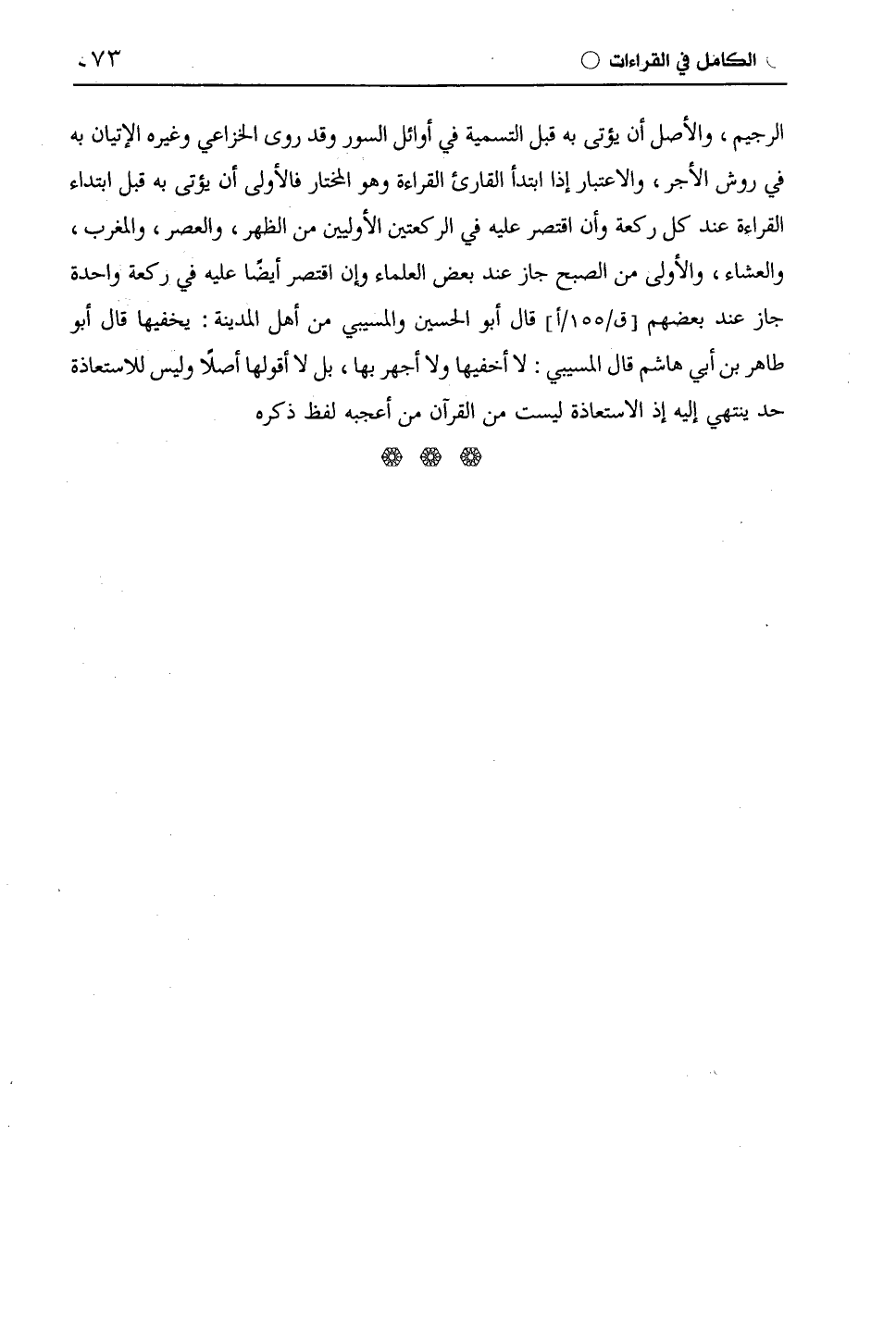 الرجيم، والأصل أن يؤتى به قبل التسمية في أوائل السور وقد روى الْخُزَاعِيّ وغيره الإتيان به في روش الأجر، والاعتبار إذا ابتدأ القارئ القراءة وهو المختار فالأولى أن يؤتى به قبل ابتداء القراءة عند كل ركعة وإن اقتصر عليه في الركعتين الأوليين من الظهر، والعصر، والمغرب، والعشاء، والأولى من الصبح جاز عند بعض العلماء وإن اقتصر أيضًا عليه في ركعة واحدة جاز عند بعضهم قال أبو الحسين والْمُسَيَّبِيّ من أهل المدينة: يخفيها قال أبو طاهر بن أبي هاشم قال الْمُسَيَّبِيّ: لا أخفيها ولا أجهر بها، بل لا أقولها أصلا وليس للاستعاذة حد ينتهي إليه إذ الاستعاذة ليست من القرآن من أعجبه لفظ ذكره.