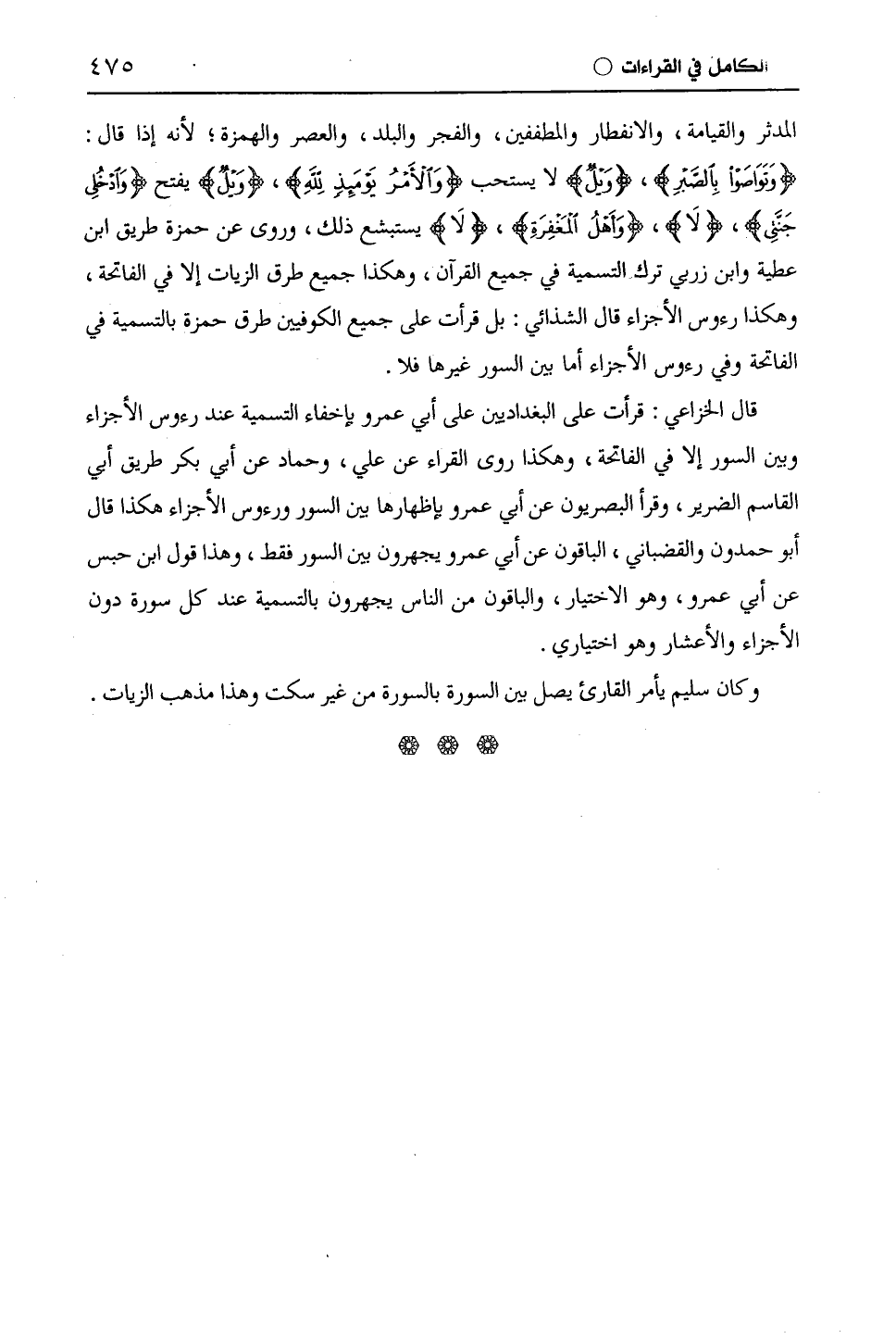 المدثر والقيامة، والانفطار والمطففين، والفجر والبلد، والعصر والهمزة؛ لأنه إذا قال: (وَتَوَاصَوْا بِالصَّبْرِ)، (وَيْلٌ) لا يستحب (وَالْأَمْرُ يَوْمَئِذٍ لِلَّهِ)، (وَيْلٌ) يفتح (وَادْخُلِي جَنَّتِي)، (لَا)، (وَأَهْلُ الْمَغْفِرَةِ)، (لَا) يستبشع ذلك، وروى عن حَمْزَة طريق ابن عطية وابن زربي ترك التسمية في جميع القرآن، وهكذا جميع طرق الزَّيَّات إلا في الفاتحة، وهكذا رءوس الأجزاء قال الشَّذَائِيّ: بل قرأت على جميع الكوفيين طرق حَمْزَة بالتسمية في الفاتحة وفي رءوس الأجزاء أما بين السور غيرها فلا.