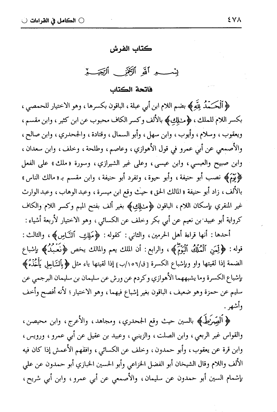(الْحَمْدُ لِلَّهِ) بضم اللام ابن أبي عبلة، الباقون بكسرها، وهو الاختيار للحمصي، بكسر اللام للملك، (مَالِكِ) بالألف وكسر الكاف محبوب عن ابْن كَثِيرٍ، وابْن مِقْسَمٍ، ويَعْقُوب، وسلام، وأيوب، وابن سهل، وأبو السَّمَّال، وقَتَادَة، والْجَحْدَرِيّ، وابن صالح، والأصمعي عن أَبِي عَمْرٍو في قول الأهوازي، وعَاصِم، وطَلْحَة، وخلف، وابْن سَعْدَانَ، وابن صبيح والْعَبْسِيّ، وابن عيسى، وعلى غير الشيرازي، وسورة " ملك " على الفعل (يَوْمَ) نصب أبو حنيفة، وأبو حيوة، وتفرد أبو حنيفة، وابْن مِقْسَمٍ بـ " مالك الناس " بالألف، زاد أبو حنيفة " المالك الحق " حيث وقع ابن ميسرة، وعبد الوهاب، وعبد الوارث غير المنقري بإسكان اللام، الباقون (مَلِكِ) بغير ألف بفتح الميم وكسر اللام والكاف كرواية أبو عبيد بن نعيم عن أبي بكر وخلف عن الكسائي، وهو الاختيار لأربعة أشياء: أحدها: أنها قراءة أهل الحرمين، والثاني: كقوله ة (مَلِكِ النَّاسِ)، والثالث: قوله: (لِمَنِ الْمُلْكُ الْيَوْمَ)، والرابع: أن الملك يعم والمالك يخص (نَعْبُدُ) بإشباع الضمة إذا لقيتها واو وبإشباع الكسرة إذا لقيتها ياء مثل (بِالسَّاحِلِ يَأْخُذْهُ) بإشباع الكسرة وما يشبههما الأهوازي وكردم عن ورش عن سليمان بن سليمان البرجمي عن سليم عن حَمْزَة وهو ضعيف، الباقون بغير إشباع فيهما، وهو الاختيار؛ لأنه أفصح وأخف وأشهر.