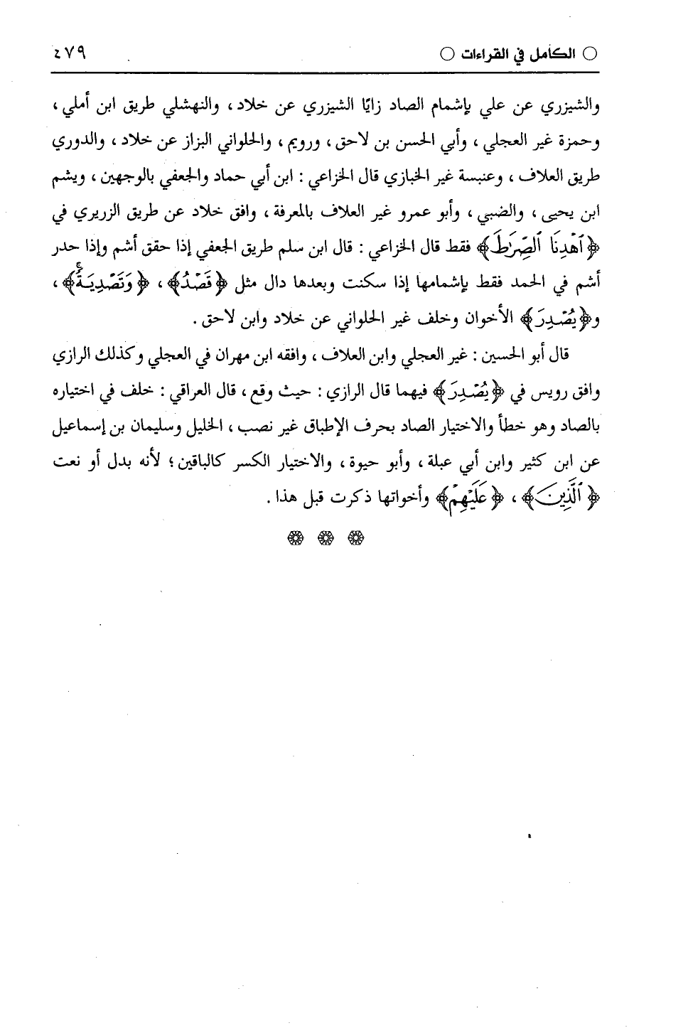 قال أبو الحسين: غير العجلي وابن العلاف، وافقه ابن مهران في العجلي وكذلك الرَّازِيّ وافق رويم في (يُصْدِر) فيهما قال الرَّازِيّ: حيث وقع، قال العراقي: خلف في اختياره بالصاد وهو خطأ والاختيار الصاد بحرف الإطباق غير نصب، الخليل وسليمان بن إسماعيل عن ابْن كَثِيرٍ وابن أبي عبلة، وأبو حيوة، والاختيار الكسر كالباقين، لأنه بدل أو نعت (الَّذِينَ)، (عَليهِم) وأخواتها ذكرت قبل هذا.