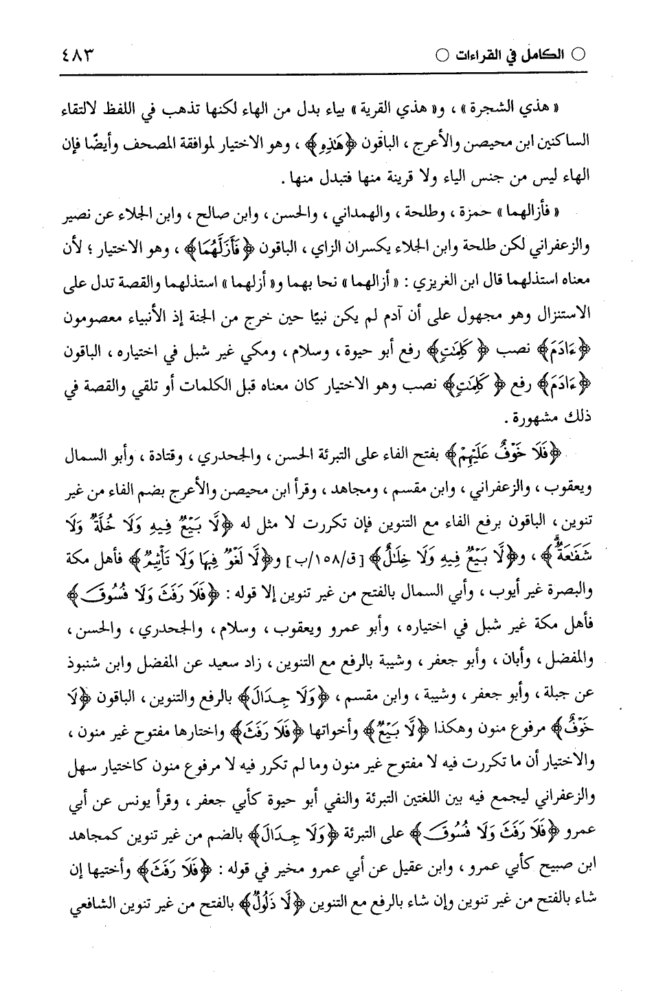 (فأزالهما) حَمْزَة، وطَلْحَة، والهمداني، والحسن، وابن صالح، وابن الجلاء عن نصير والزَّعْفَرَانِيّ لكن طَلْحَة وابن الجلاء يكسران الزاي، الباقون (فَأَزَلَّهُمَا)، وهو الاختيار؛ لأن معناه استذلهما قال ابن الغريزي: " أزالهما لا نحاهما و " أزلهما " استذلهما والقصة تدل على الاستنزال وهو مجهول على أن آدم لم يكن نبيًا حين خرج من الجنة إذ الأنبياء معصومون (ءَادَمَ) نصب (كَلِمَاتٍ) رفع أبو حيوة، وسلام، ومكي غير شِبْل في اختياره، الباقون (ءَادَمُ) رفع (كَلِمَاتٍ) نصب وهو الاختيار كان معناه قبل الكلمات أو تلقي والقصة في ذلك مشهورة.