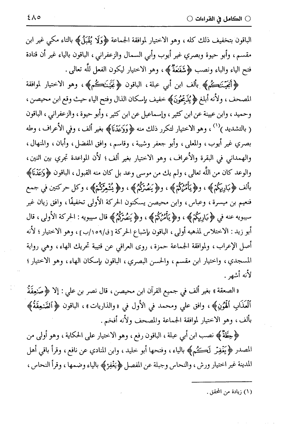 (أَنْجَيْنَاكُمْ) بألف ابن أبي عبلة، الباقون (نَجَّيْنَاكُمْ)، وهو الاختيار لموافقة المصحف، ولأنه أبلغ (يُذَبِّحُونَ) خفيف بإسكان الذال وفتح الياء حيث وقع ابن مُحَيْصِن، وَحُمَيْد، وابن عيينة عن ابْن كَثِيرٍ، وإسماعيل عن ابْن كَثِيرٍ، وأبو حيوة، والزَّعْفَرَانِيّ، الباقون بالتشديد، وهو الاختيار لتكرر ذلك منه (وَعَدْنَا) بغير ألف، وفي الأعراف، وطه بصري غير أيوب، والْمُعَلَّى، وأبو جعفر وشيبة، وقاسم، وافق المفضل، وأبان، والمنهال، والهمداني في البقرة والأعراف، وهو الاختيار بغير ألف؛ لأن المواعدة تجري بين اثنين، والوعد كان من اللَّه تعالى، ولم يك من موسى وعد بل كان منه القبول، الباقون (وَاعَدْنَا) بألف (بَارِئِكُمْ)، و (يَأْمُرُكُمْ)، و (يَنْصُرْكُمُ)، و (يُشْعِرُكُمْ)، وكل حركتين في جمع فنعيم بن ميسرة، وعباس، وابن مُحَيْصِن يسكنون الحركة الأولى تخفيفًا، وافق زيان غير سيبويه عنه في (بَارِئِكُمْ)، و (يَأْمُرُكُمْ)، و (يَنْصُرْكُمُ) قال سيبويه: الحركة الأولى، قال أبو زيد: الاختلاس لمذهبه أولى، الباقون بإشباع الحركة، وهو الاختيار، لأنه أصل الإعراب، ولموافقة الجماعة حَمْزَة، روى العراقي عن قُتَيْبَة تحريك الهاء، وهي رواية المسجدي، واختيار ابْن مِقْسَمٍ، والحسن البصري، الباقون بإسكان الهاء، وهو الاختيار؛ لأنه أشهر.