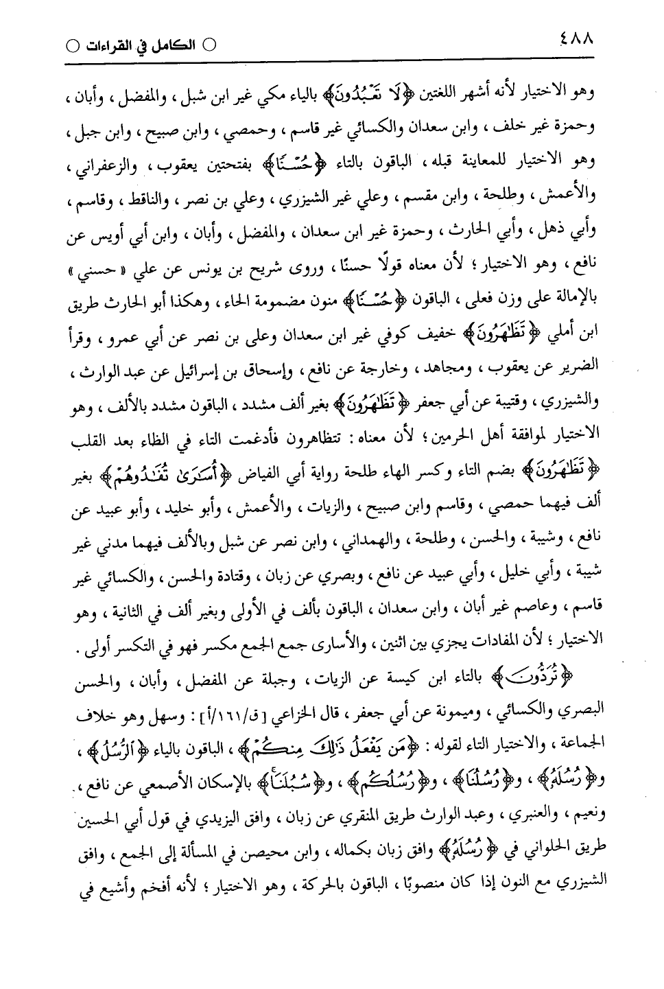 وهو الاختيار لأنه أشهر اللغتين (لَا تَعْبُدُونَ) بالياء مكي غير ابن شِبْل، والمفضل، وأبان، وحَمْزَة غير خلف، وابْن سَعْدَانَ والكسائي غير قاسم، وحمصي، وابن صبيح، وابن جبل، وهو الاختيار للمعاينة قبله، الباقون بالتاء (حَسَنًا) بفتحتين يَعْقُوب، والزَّعْفَرَانِيّ، والْأَعْمَش، وطَلْحَة، وابْن مِقْسَمٍ، وعلي غير الشيزري، وعلي بن نصر، والناقط، وقاسم، وأبي ذهل، وأبي الحارث، وحَمْزَة غير ابْن سَعْدَانَ، والمفضل، وأبان، وابن أبي أويس عن نافع، وهو الاختيار؛ لأن معناه قولًا حسنًا، وروى شريح بن يونس عن علي " حسني " بالإمالة على وزن فعلى، الباقون (حُسْنًا) منون مضمومة الحاء، وهكذا أبو الحارث طريق ابن أملي (تَظَاهَرُونَ) خفيف كوفي غير ابْن سَعْدَانَ وعلى بن نصر عن أَبِي عَمْرٍو، وقرأ الضَّرِير عن يَعْقُوب، ومجاهد، وخارجة عن نافع، وإسحاق بن إسرائيل عن عبد الوارث، والشيزري، وقُتَيْبَة عن أبي جعفر (تَظَّهَّرُونَ) بغير ألف مشدد، الباقون مشدد بالألف، وهو الاختيار لموافقة أهل الحرمين؛ لأن معناه: تتظاهرون فأدغمت التاء في الظاء بعد القلب (تُظَاهِرُونَ) بضم التاء وكسر الهاء طَلْحَة رواية أبي الفياض (أُسَارَى تُفَادُوهُمْ) بغير ألف فيهما حمصي، وقاسم وابن صبيح، والزَّيَّات، والْأَعْمَش، وأبو خليد، وأبو عبيد عن نافع، وشيبة، والحسن، وطَلْحَة، والهمداني، وابن نصر عن شِبْل وبالألف فيهما مدني غير شيبة، وأبي خليل، وأبي عبيد عن نافع، وبصري عن زبان، وقَتَادَة والحسن، والكسائي غير قاسم، وعَاصِم غير أبان، وابْن سَعْدَانَ، الباقون بألف في الأولى وبغير ألف في الثانية، وهو الاختيار، لأن المفادات تجري بين اثنين، والأسارى جمع الجمع مكسر فهو في التكسر أولى.