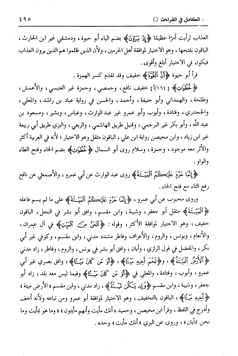 وروى محبوب عن أَبِي عَمْرٍو، (إِنَّمَا حَرَّمَ عَلَيْكُمُ الْمَيْتَةَ) على ما لم يسم فاعله (الْمَيِّتَةَ) مثقل أبو جعفر، وشيبة، وابْن مِقْسَمٍ، وافق أبو بشر في النحل، الباقون خفيف، وهو الاختيار لموافقة الأكثر، وقوله: (الْحَيَّ مِنَ الْمَيِّتِ) في آل عمران، والأنعام، ويونس، والروم، والأعراف وفاطر مشدد مدني، وابْن مِقْسَمٍ، وكوفي غير أبي بكر، والمفضل في قول الرَّازِيّ، وأبان، وافق أبو بشر في يونس، والروم، وفاطر، زاد مدني (الْأَرْضُ الْمَيْتَةُ)، و (لَحْمَ أَخِيهِ مَيْتًا)، (أَوَمَنْ كَانَ مَيْتًا)، وافق بصري غير أبي عمرو، وأيوب، وقَتَادَة، والْمُعَلَّى في (أَوَمَنْ كَانَ مَيْتًا) وفيما ليس معه بلد، زاد أبو جعفر، وشيبة، وابْن مِقْسَمٍ (وَإِنْ يَكُنْ مَيْتَةً)، زاد مدني، وابْن مِقْسَمٍ " الْأَرْضُ الْمَيْتَةُ " (أَخِيهِ مَيْتًا)، الباقون بالتخفيف، وهو الاختيار لموافقة أَبُو عَمْرٍو ومن تباعه ولأنه أخف وأدرج في اللفظ، وقرأ ابن مُحَيْصِن، وَحُمَيْد " إنك مأيت وإنهم مأيتون " " وما هو بمأيت " " وما نحن بمأيتين "، وروى عن البزي إنك مأيت " وحده.