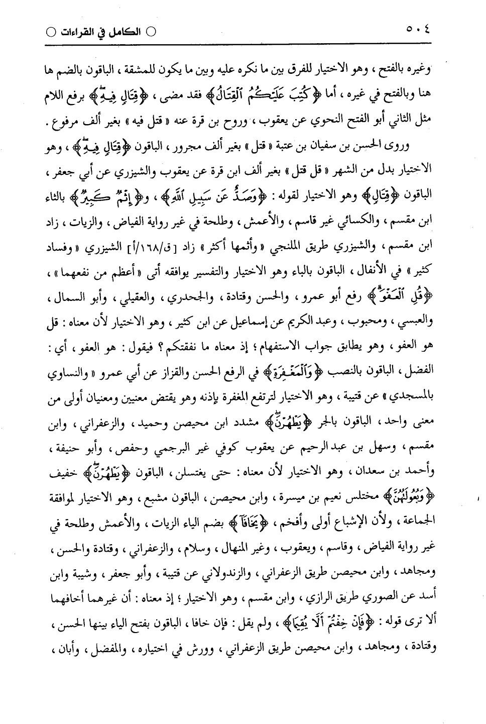 وروى الحسن بن سفيان بن عتبة " قَتْلٍ " بغير ألف مجرور، الباقون (قِتَالٍ فِيهِ)، وهو الاختيار بدل من الشهر " قُلْ قَتْلٌ " بغير ألف ابْن قُرَّةَ عن يَعْقُوب والشيزري عن أبي جعفر، الباقون (قِتَالٌ) وهو الاختيار لقوله: (وَصَدٌّ عَنْ سَبِيلِ اللَّهِ)، و (إِثْمٌ كَبِيرٌ) بالثاء ابْن مِقْسَمٍ، والكسائي غير قاسم، والْأَعْمَش، وطَلْحَة في غير رواية الفياض، والزيات، زاد ابْن مِقْسَمٍ، والشيزري طريق الملنجي " وأثمها أكثر " زاد الشيزري " وفساد كثير " في الأنفال، الباقون بالباء وهو الاختيار والتفسير يوافقه أتى " أعظم من نفعهما "، (قُلِ الْعَفْوَ) رفع أَبُو عَمْرٍو، والحسن وقَتَادَة، والْجَحْدَرَيّ، والعقيلي، وأبو السَّمَّال، والْعَبْسِيّ، ومحبوب، وعبد الكريم عن إسماعيل عن ابْن كَثِيرٍ، وهو الاختيار لأن معناه: قل هو العفو، وهو يطابق جواب الاستفهام؛ إذ معناه ما نفقتكم؟ فيقول: هو العفو، أبي الفضل، الباقون بالنصب (وَالْمَغْفِرَةِ) في الرفع الحسن والقزاز عن أَبِي عَمْرٍو " والنساوي بالمسجدي " عن قُتَيْبَة، وهو الاختيار لترتفع المغفرة بإذنه وهو يقتضي معنيين ومعنيان أولى من معنى واحد، الباقون بالجر (يَطَّهَّرْنَ) مشدد ابن مُحَيْصِن وحميد، والزَّعْفَرَانِيّ، وابن مقسم، وسهل بن عبد الرحيم عن يَعْقُوب كوفي غير البرجمي وحفص، وأبو حنيفة، وأحمد بْن سَعْدَانَ، وهو الاختيار لأن معناه: حتى يغتسلن، الباقون (يَطْهُرْنَ) خفيف (وَبُعُولَتُهُنَّ) مختلس نعيم بن ميسرة، وابن مُحَيْصِن، الباقون مشبع، وهو الاختيار لموافقة الجماعة، ولأن الإشباع أولى وأفخم، (يُخَافَا) بضم الياء الزيات، والْأَعْمَش وطَلْحَة في غير رواية الفياض، وقاسم، ويعقوب، وغير المنهال، وسلام، والزَّعْفَرَانِيّ، وقَتَادَة والحسن، ومجاهد، وابن مُحَيْصِن طريق الزَّعْفَرَانِيّ، والزندولاني عن قُتَيْبَة، وأبو جعفر، وشيبة وابن أسد عن الصوري طريق الرَّازِيّ، وابْن مِقْسَمٍ، وهو الاختيار؛ إذ معناه: أن غيرهما أخافهما ألا ترى قوله: (فَإِنْ خِفْتُمْ أَلَّا يُقِيمَا)، ولم يقل: فإن خافا، الباقون بفتح الياء بينها الحسن، وقَتَادَة، ومجاهد، وابن مُحَيْصِن طريق الزَّعْفَرَانِيّ، وورش في اختياره، والمفضل، وأبان،