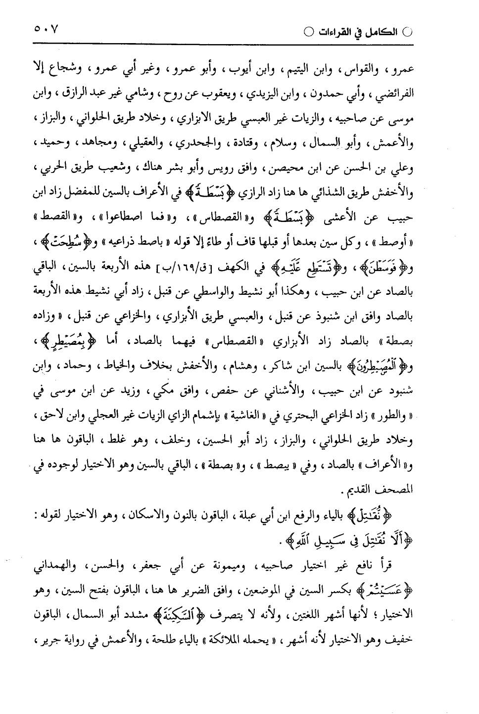 عمرو، والقواس، وابن اليتيم، وابن أيوب، وأَبُو عَمْرٍو، وغير أَبِي عَمْرٍو، وشجاع إلا الفرائضي، وأبي حمدون، وابن الْيَزِيدِيّ، ويَعْقُوب عن روح، وشامي غير عبد الرازق، وابن موسى عن صاحبيه، والزَّيَّات غير الْعَبْسِيّ طريق الأبزاري، وخَلَّاد طريق الحلواني، والبزاز، والْأَعْمَش، وأبو السَّمَّال، وسلام، وقَتَادَة، والْجَحْدَرِيّ، والعقيلي، ومجاهد، وَحُمَيْد، وعلي بن الحسن عن ابن مُحَيْصِن، وافق رُوَيْس وأبو بشر هناك، وشعيب طريق الحربي، والْأَخْفَش طريق الشَّذَائِيّ ها هنا زاد الرَّازِيّ (بَسْطَةً) في الأعراف بالسين للمفضل زاد ابن حبيب عن الأعشى (بَسْطَةً) و (القصطاس)، و (فما اصطاعوا)، و (القصط) " أوصط "، وكل سين بعدها أو قبلها قاف أو طاءً إلا قوله (بَاسِطٌ ذِرَاعَيْهِ) و (سُطِحَتْ)، و (فَوَسَطْنَ)، و (تَسْتَطِعْ عَلَيْهِ) في الكهف، هذه الأربعة بالسين، الباقي بالصاد عن ابن حبيب، وهكذا أبو نشيط والواسطي عن قُنْبُل، زاد أبي نشيط هذه الأربعة بالصاد وافق ابْن شَنَبُوذَ عن قُنْبُل، والْعَبْسِيّ طريق الأبزاري، والْخُزَاعِيّ عن قُنْبُل، " وزاده بصطة " بالصاد زاد الأبزاري " القصطاس " فيهما بالصاد، أما (بِمُصَيطِرٍ)، و (الْمُصَيْطِرُونَ) بالسين ابن شاكر، وهشام، والْأَخْفَش بخلاف والخياط، وحماد، وابن شنبود عن ابن حبيب، والْأُشْنَانِيّ عن حفص، وافق مكي، وزيد عن ابن موسى في " والطور " زاد الْخُزَاعِيّ البحتري في " الغاشية " بإشمام الزاي الزَّيَّات غير العجلي وابن لاحق، وخَلَّاد طريق الحلواني، والبزاز، زاد أبو الحسين، وخلف، وهو غلط، الباقون ها هنا و " الأعراف " بالصاد، وفي " يبصط "، و " بصطة "، الباقي بالسين وهو الاختيار لوجوده في المصحف القديم. (نُقَاتِلْ) بالياء والرفع ابن أبي عبلة، الباقون بالنون والإسكان، وهو الاختيار لقوله: (أَلَّا نُقَاتِلَ فِي سَبِيلِ اللَّهِ).