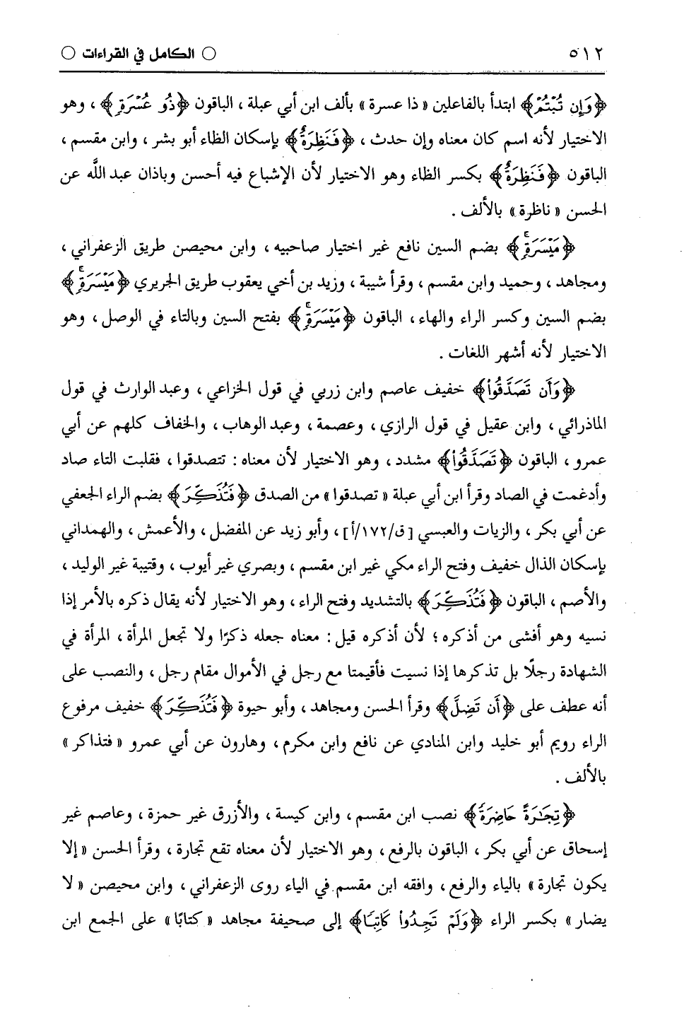 (وَإِنْ تُبْتُمْ) ابتدأ بالفاعلين (ذَا عُسْرَةٍ) بألف ابن أبي عبلة، الباقون (ذُو عُسْرَةٍ)، وهو الاختيار لأنه اسم كان معناه وإن حدث، (فَنَظْرَةٌ) بإسكان الظاء أبو بشر، وابْن مِقْسَمٍ، الباقون (فَنَظِرَةٌ) بكسر الظاء وهو الاختيار لأن الإشباع فيه أحسن وباذان عبد اللَّه عن الحسن (ناظرة) بالألف.