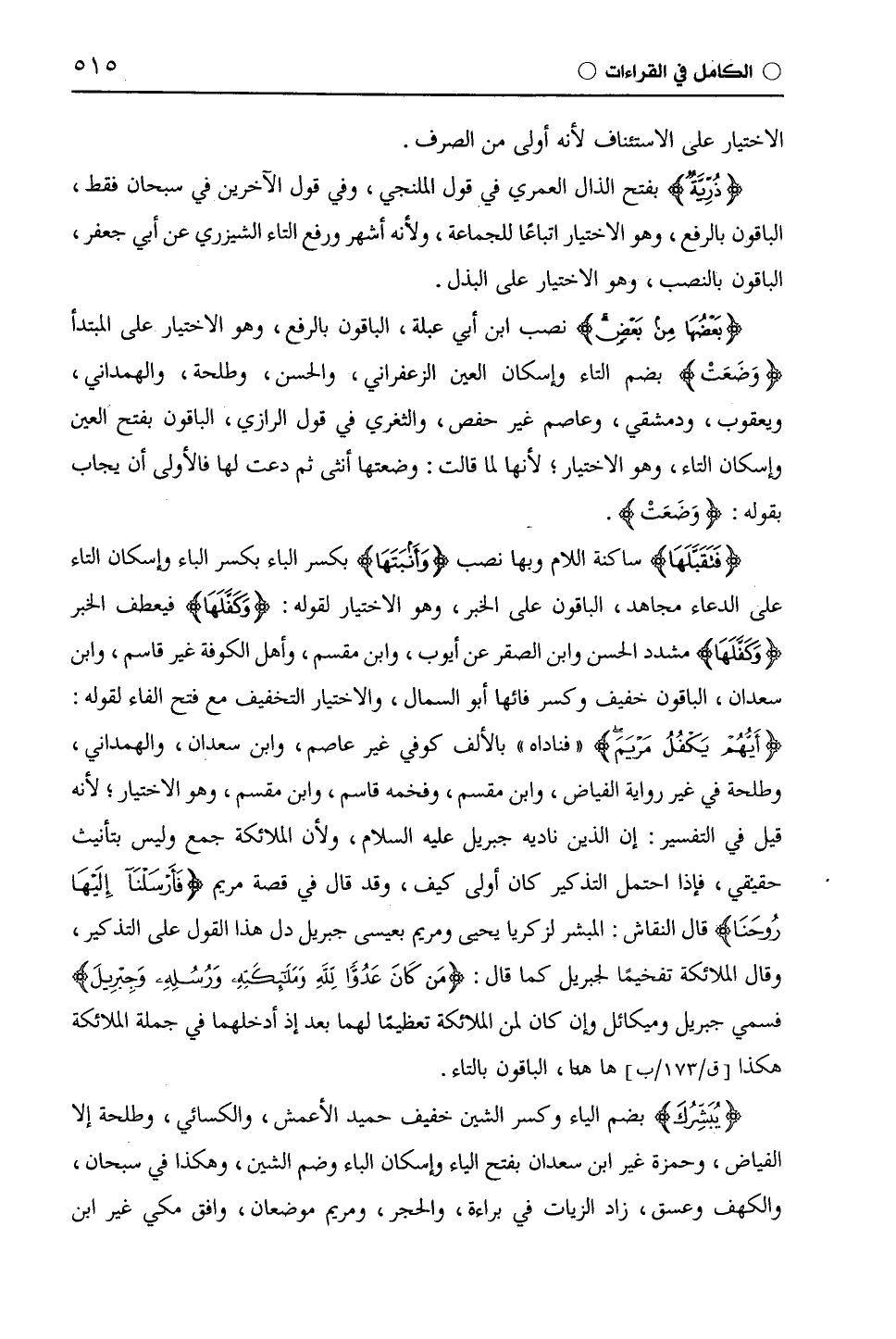 (فَتَقَبَّلَهَا) ساكنة اللام وبها نصب (وَأَنْبَتَهَا) بكسر الباء بكسر الباء وإسكان التاء على الدعاء مجاهد، الباقون على الخبر، وهو الاختيار لقوله: (كَفَّلَهَا) فيعطف الخبر (وَكَفَّلَهَا) مشدد الحسن وابن الصقر عن أيوب، وابْن مِقْسَمٍ، وأهل الكوفة غير قاسم، وابن سعدان، الباقون خفيف وكسر فائها أبو السَّمَّال، والاختيار التخفيف مع فتح الفاء لقوله: (أَيُّهُمْ يَكْفُلُ مَرْيَمَ) " فناداه " بالألف كوفي غير عَاصِم، وابْن سَعْدَانَ، والهمداني، وطَلْحَة في غير رواية الفياض، وابْن مِقْسَمٍ، وفخمه قاسم، وابْن مِقْسَمٍ، وهو الاختيار؛ لأنه قيل في التفسير: إن الذي ناداه جبريل عليه السلام، ولأن الملائكة جمع وليس بتأنيث حقيقي، فإذا احتمل التذكير كان أولى كيف، وقد قال في قصة مريم (فَأَرْسَلْنَا إِلَيْهَا رُوحَنَا) قال النَّقَّاش: المبشر لزكريا يحيى ومريم بعيسى جبريل دل هذا القول على التذكير، وقال الملائكة تفخيمًا لجبريل كما قال: (مَنْ كَانَ عَدُوًّا لِلَّهِ وَمَلَائِكَتِهِ وَرُسُلِهِ وَجِبْرِيلَ) فسمى جبريل وميكائل وإن كانا من الملائكة تعظيمًا لهما بعد إذ أدخلهما في جملة الملائكة هكذا ها هنا، الباقون بالتاء.